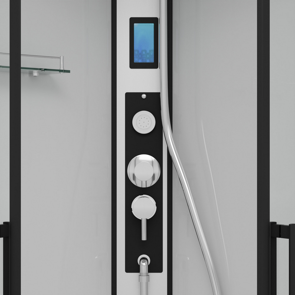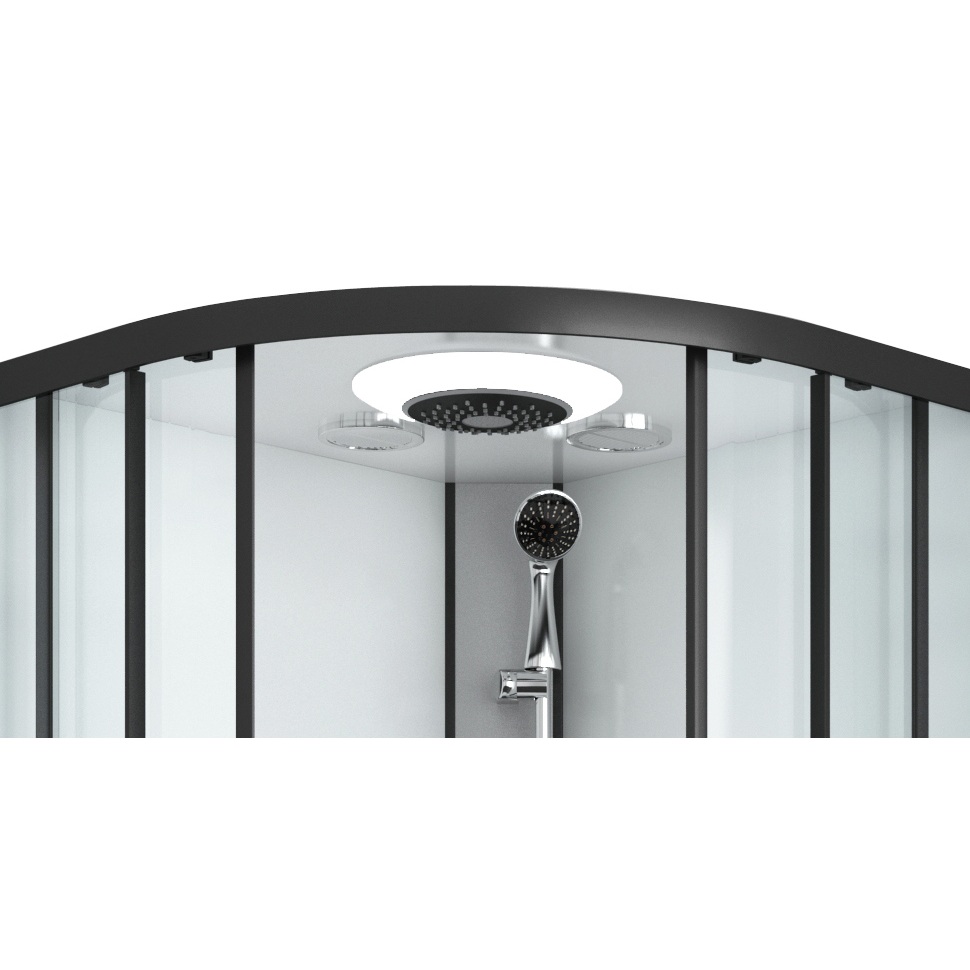 -16%Cabina semicircolare dal design moderno, con pannello posteriore bianco e profili in alluminio nero opaco. Con un idrogetto, piatto doccia e sistema di montaggio rapido Quick Line.