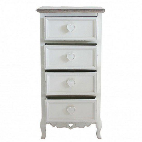 -44%Mobile da arredo in stile contemporaneo, adatto per camere e soggiorni. Ha una struttura in legno di paulownia color bianco, con piano superiore color nocciola. I 4 cassetti hanno la maniglia a forma di cuore.