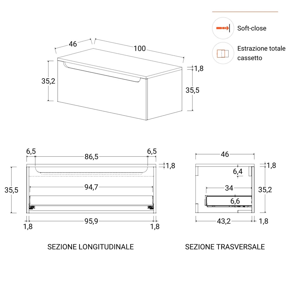Cassettiera sospesa 90×46,100×46 o 120×46 cm altezza 38 cm chiusura soft close in 7 colori BM053