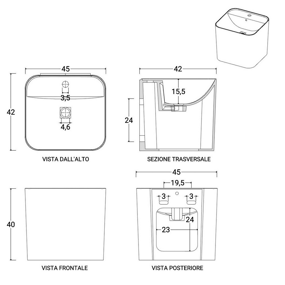 Lavabo mezzo-freestanding 45x42xH40 cm monoforo in ceramica bianco lucido LAV108