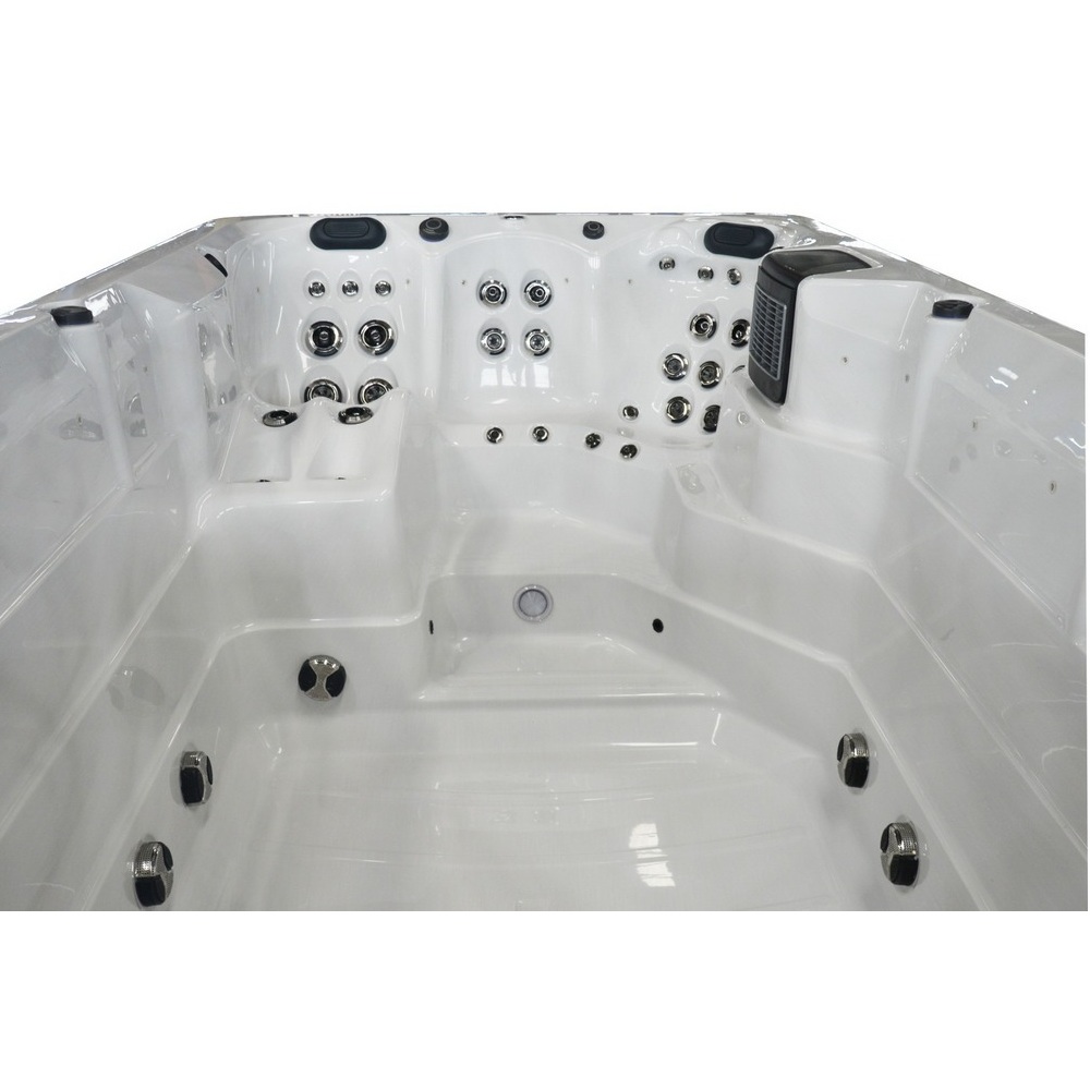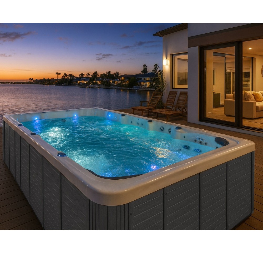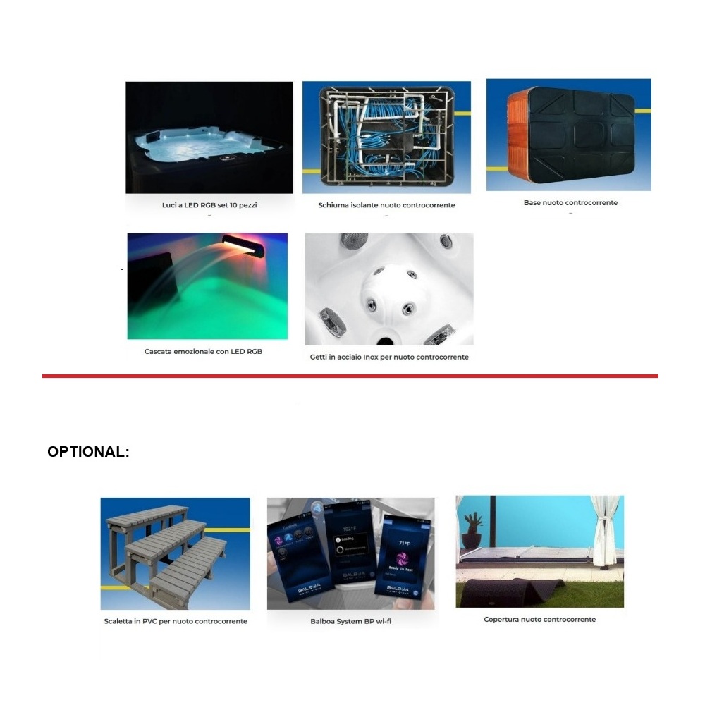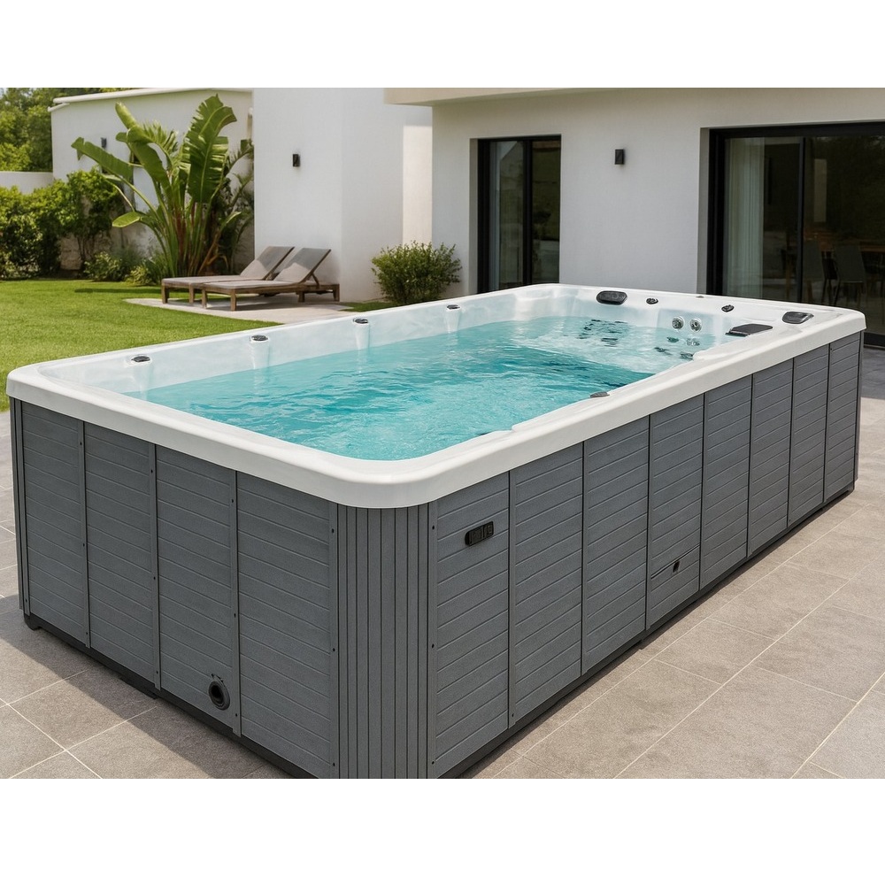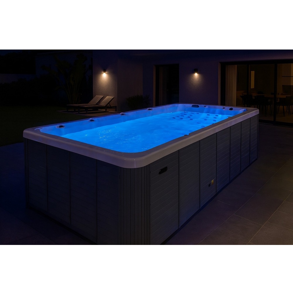 -8%Piscina da esterno da 7-9 posti, con funzione per nuoto controcorrente. Completa di luci per cromoterapia, Pc Full Touch con Bluetooth, riscaldatore Balboa e Ozonoterapia.