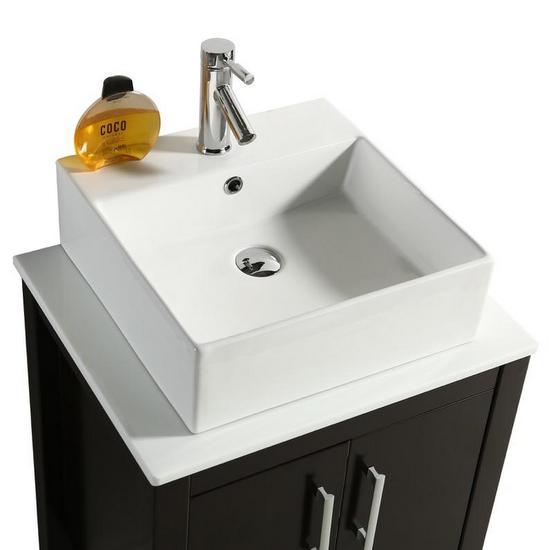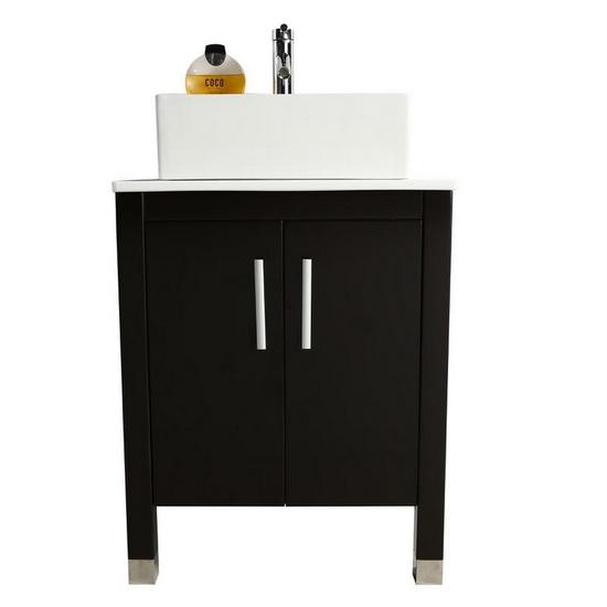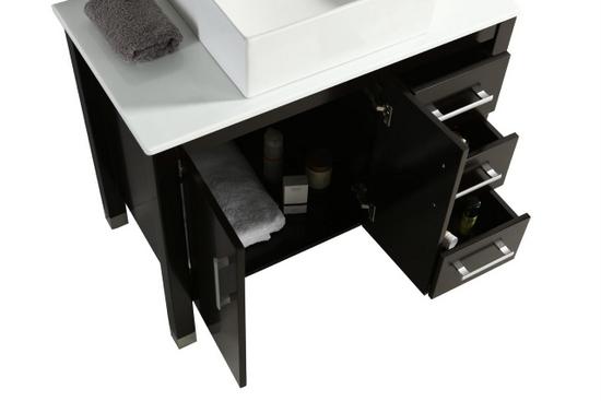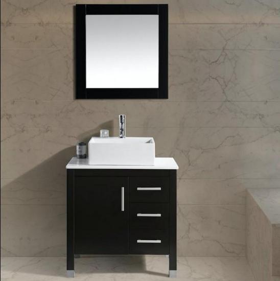 Arredo bagno in legno massello da 61, 76 o 91 cm con ante e cassetti. Colore nero con . Lavabo in ceramica, top in pietra bianco, specchio abbinato.