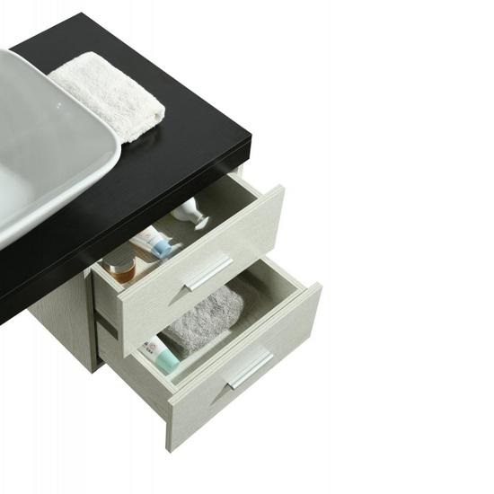 Il mobile è dotato di una mensola nera in MDF rivestito da resina melaminica (che rende il legno idrorepellente e antigraffio) di dimensioni 100x50x55 cm, di un lavabo d’appoggio in ceramica e di 2 cassetti con chiusura soft-close di colore bianco venato, e di uno specchio di dimensioni 98×80 cm. Questo mobile, essenziale ed elegante, è l’ideale per chi è cultore dell’arredo minimal.