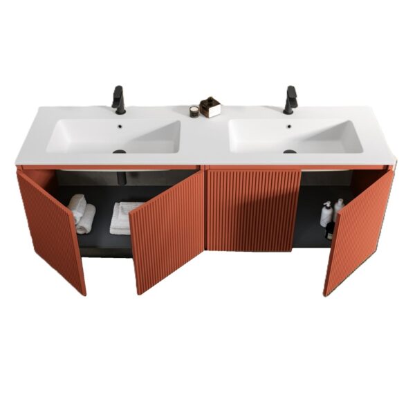 -41%Mobile bagno sospeso, completo di lavabo con doppia vasca e composto da 4 ante. Disponibile in due misure e nei colori bianco opaco, rovere deciso, verde cemento, rovere gold, carta da zucchero, antracite e terracotta, con effetto cannettato. Lo specchio è incluso nel prezzo.