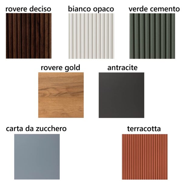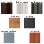 Disponibile nei colori: bianco opaco, rovere deciso, verde cemento, rovere gold, carta da zucchero, antracite, terracotta