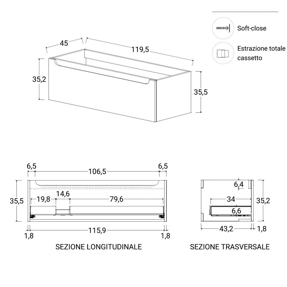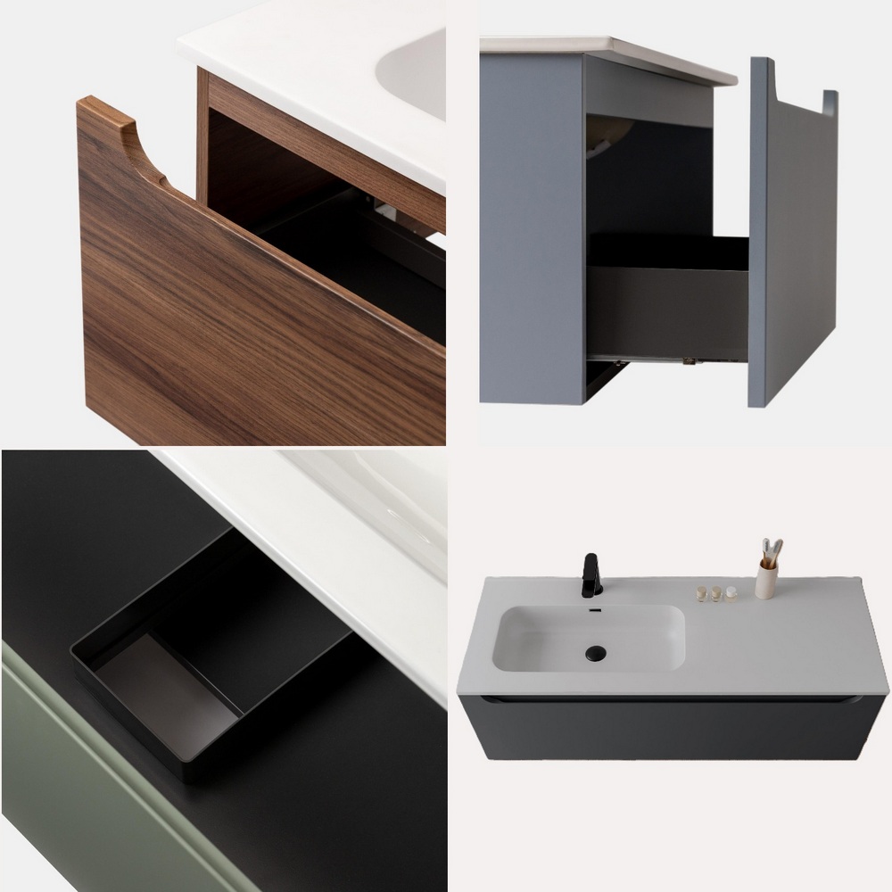 cassetto della base porta lavabo sagomato, con chiusura rallentata e apertura tramite gola (senza maniglia)