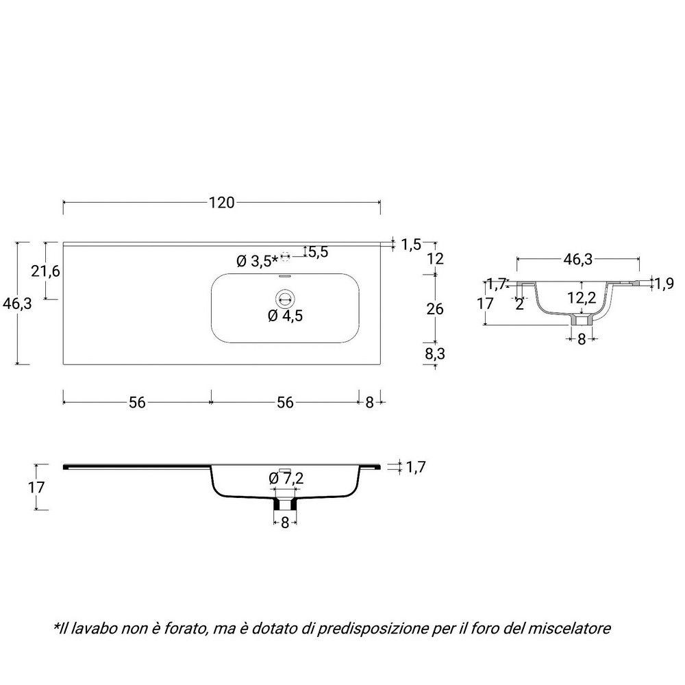 lavabo con vasca decentrata a destra o a sinistra (scegliere la versione dal menù a tendina) con foro troppopieno e predisposizione per foro miscelatore