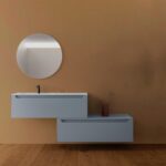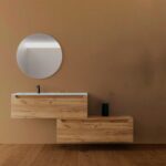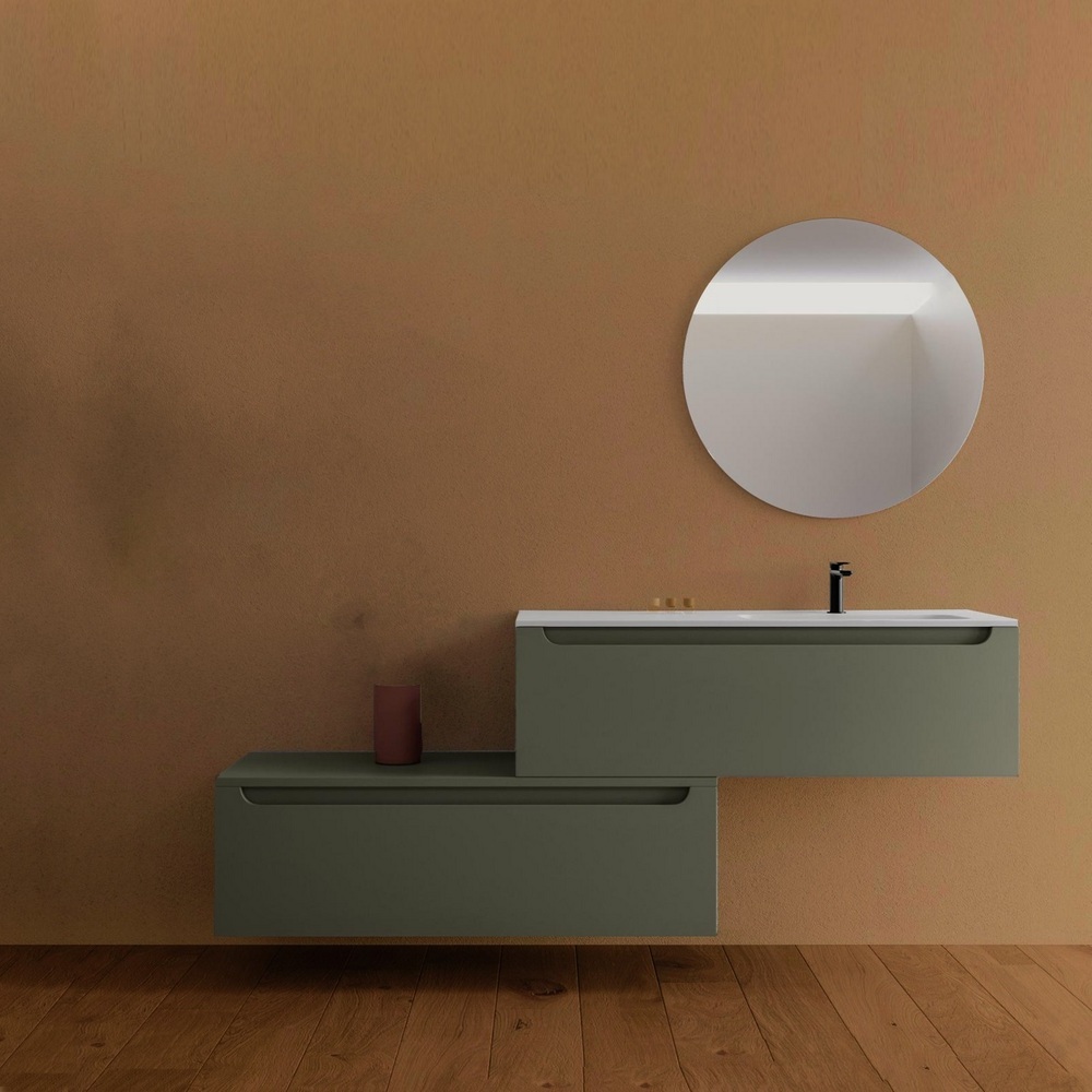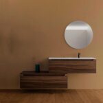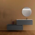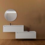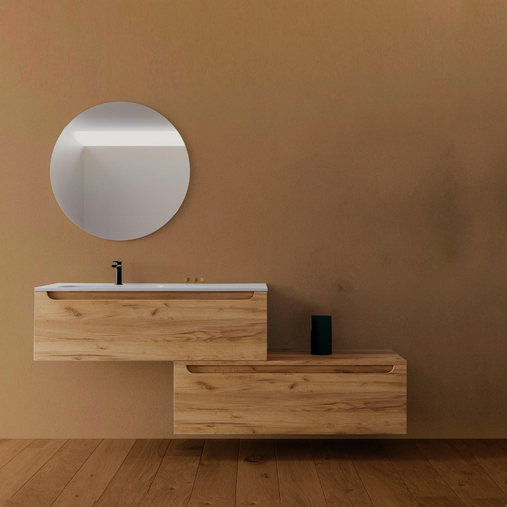 -14%Arredo moderno sospeso, con lavandino in resina e specchio filolucido rotondo. E’ possibile completare la composizione con: una cassettiera laterale e/o un pensile.