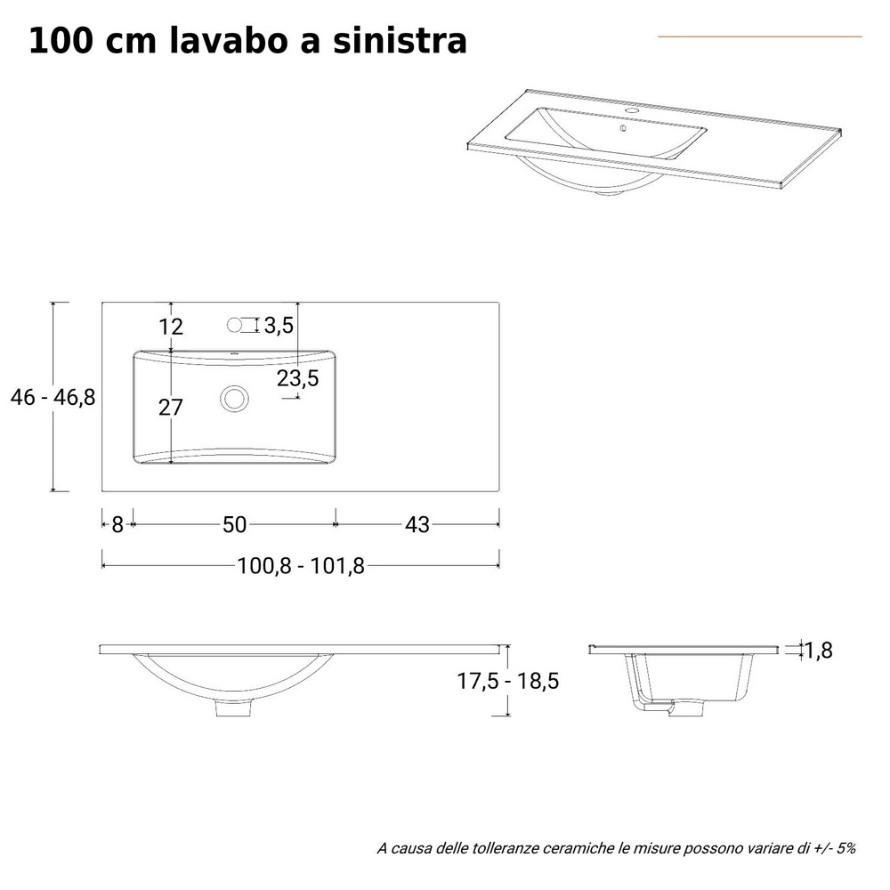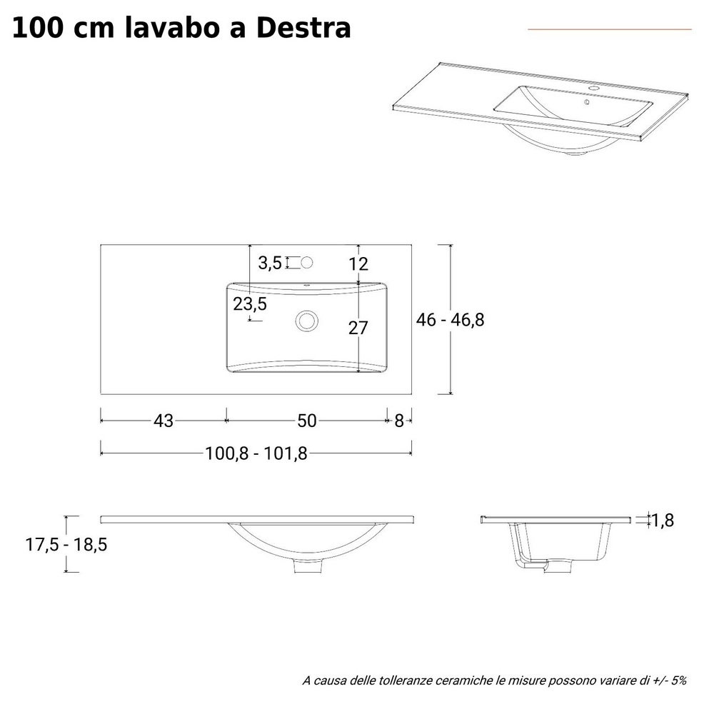 Lavabo con vasca decentrata A DESTRA oppure A SINISTRA (sopra il cassettone)