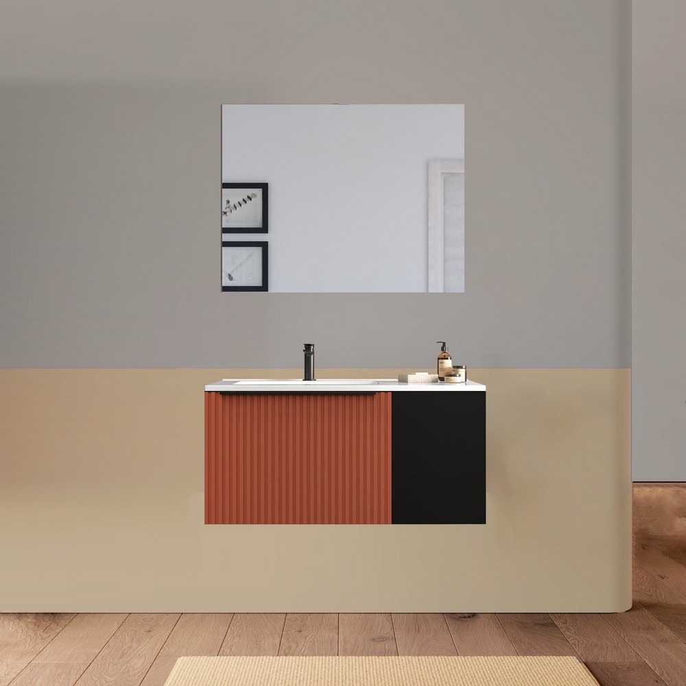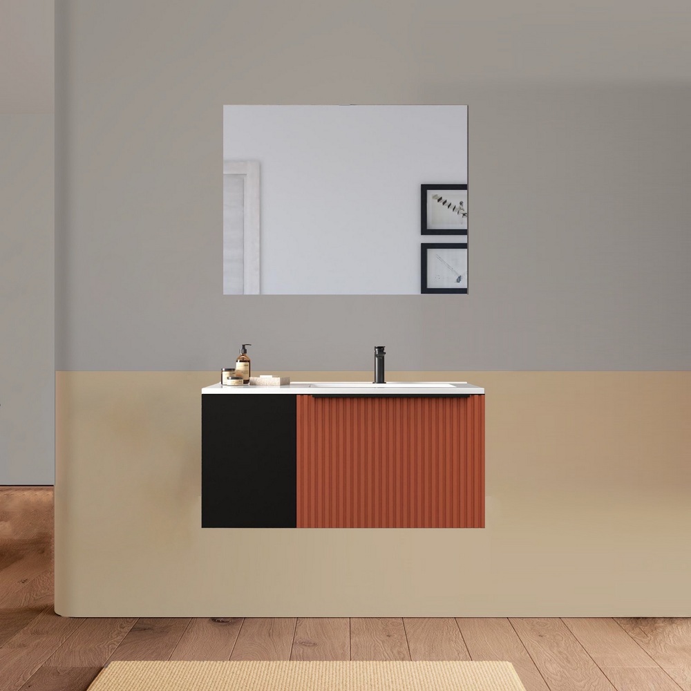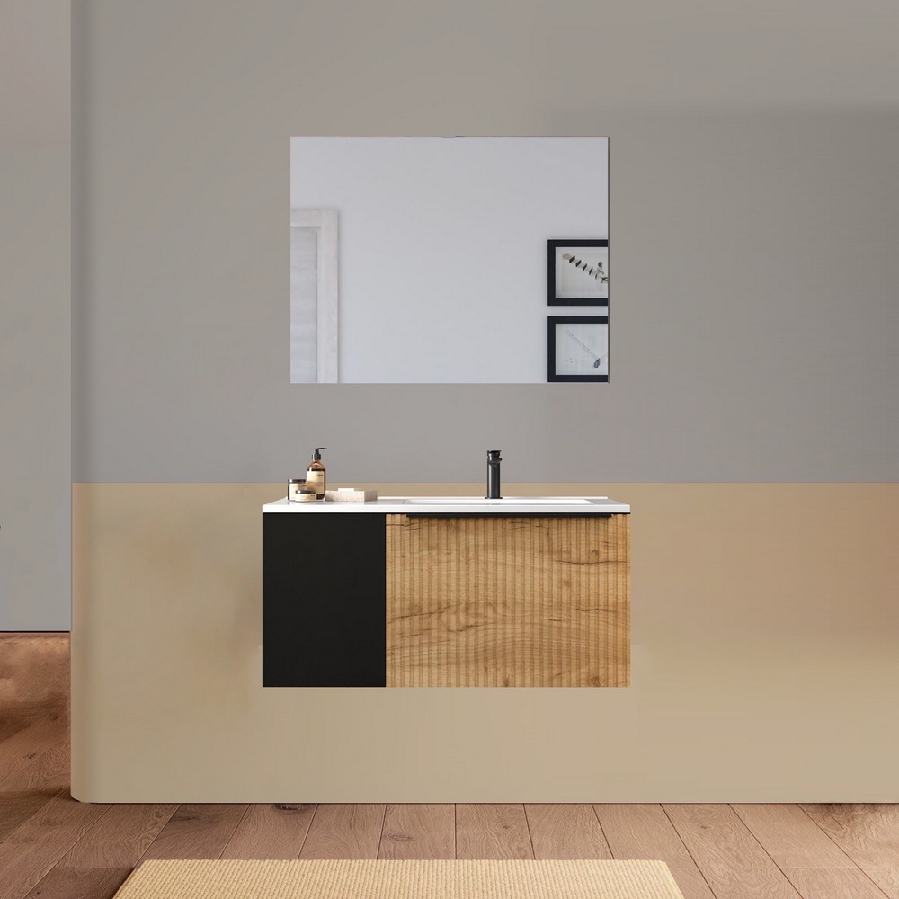 -52%Mobile bagno sospeso, disponibile in due misure e 11 colori, a tinta unita o con anta nera. Base composta da un cassettone con frontale ad effetto cannettato e un anta satinata. Il lavabo (con vasca decentrata) e lo specchio sono inclusi nel prezzo.
