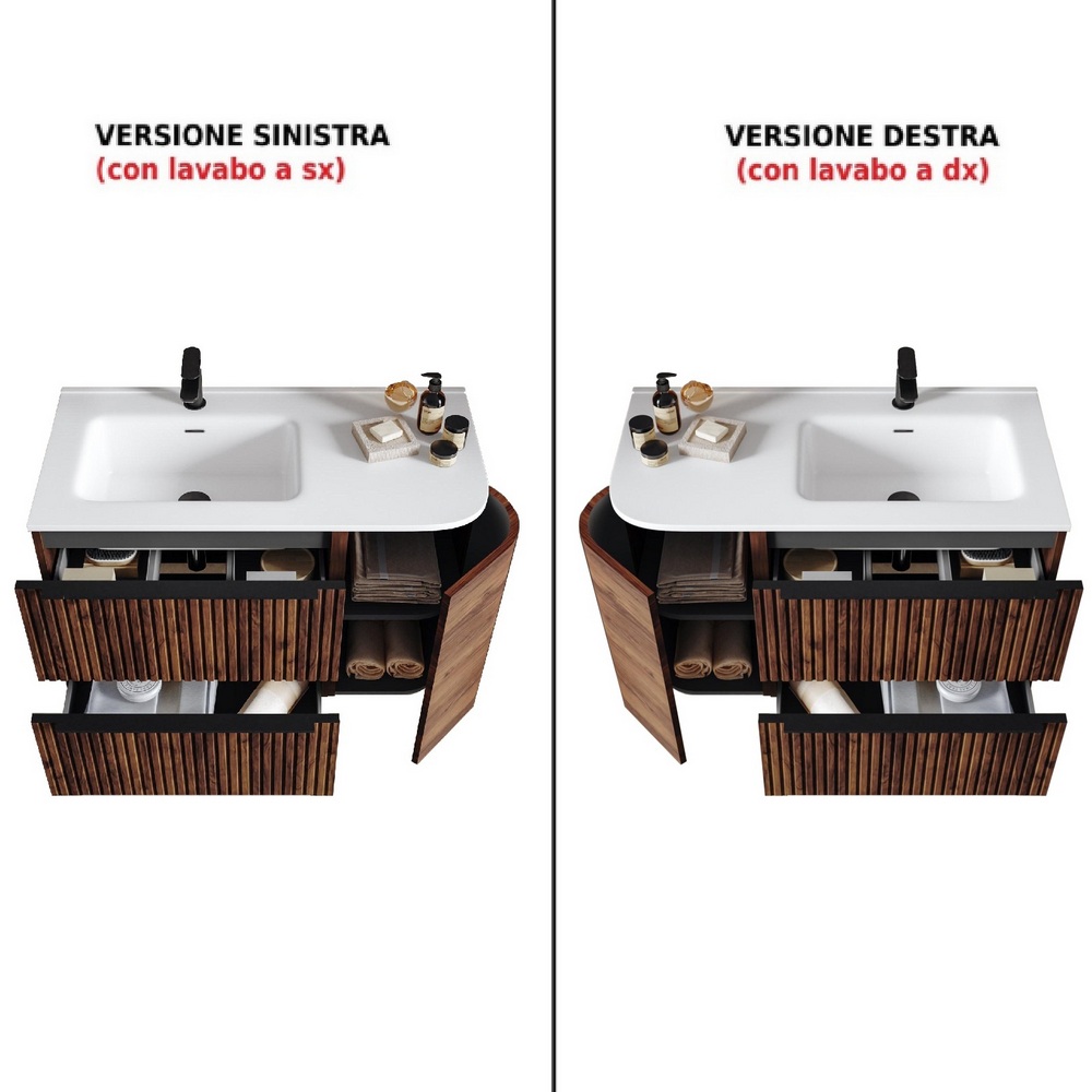 Mobile bagno Lion8 90 cm con angolo curvo 1 anta 2 cassetti e lavabo dx o sx