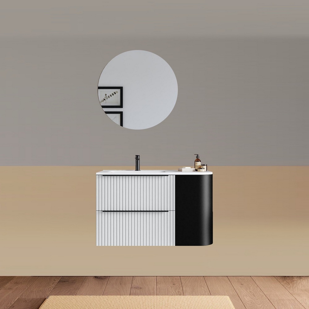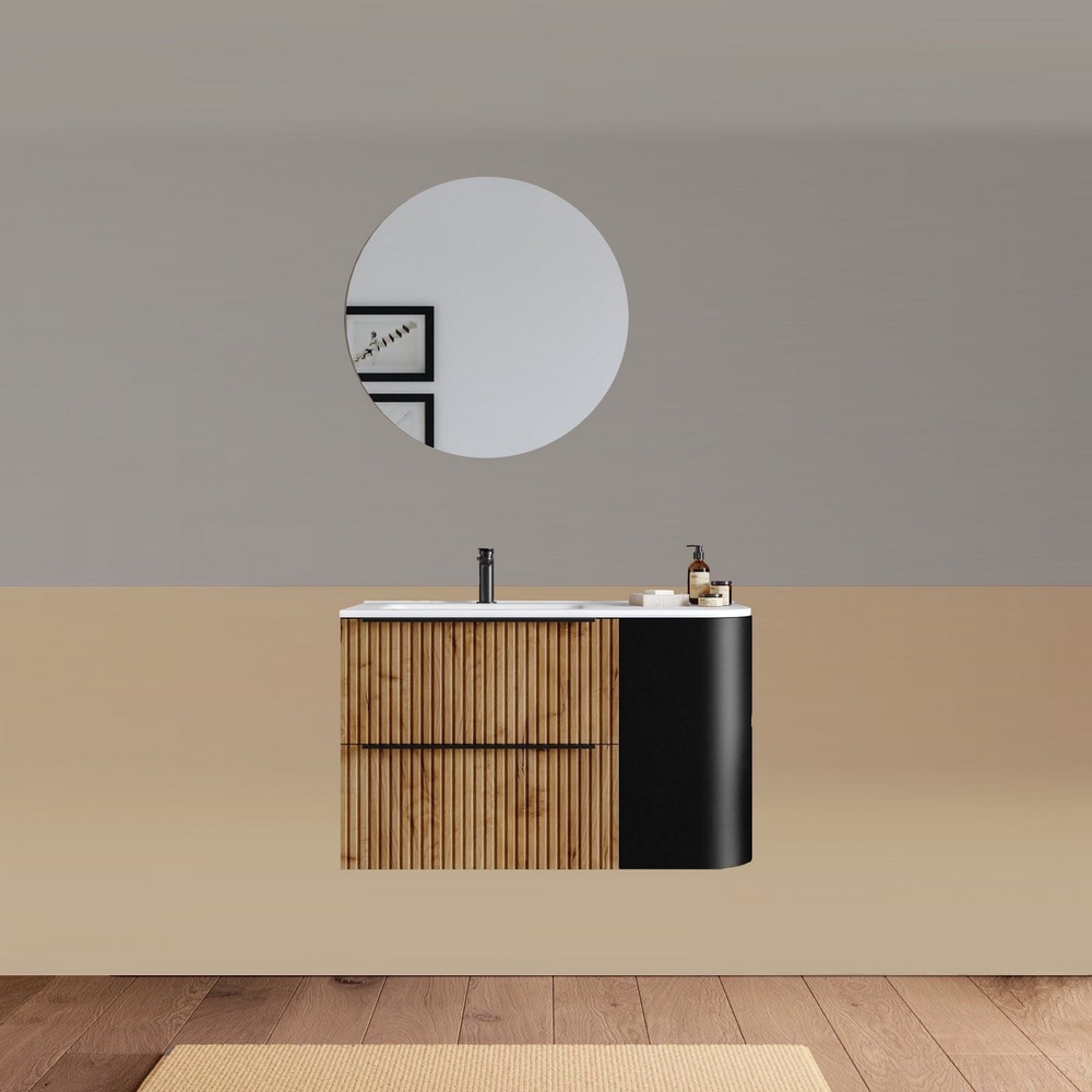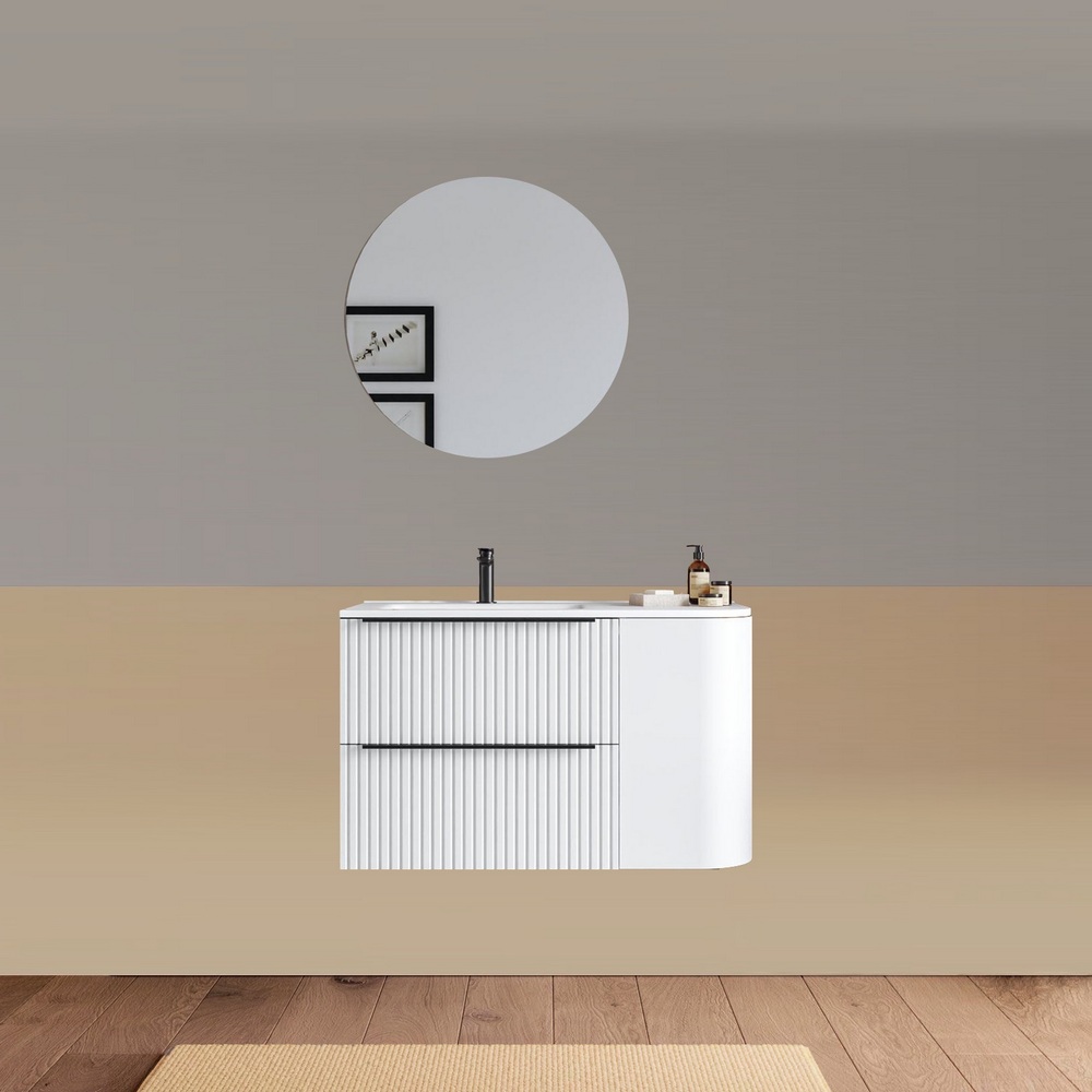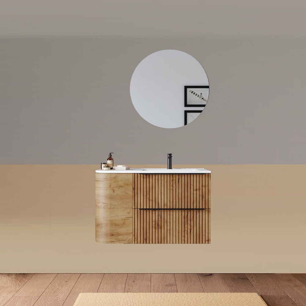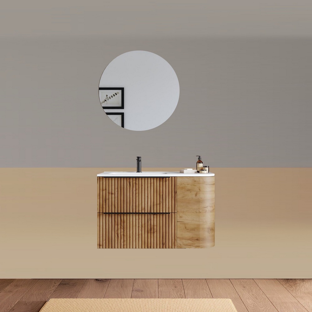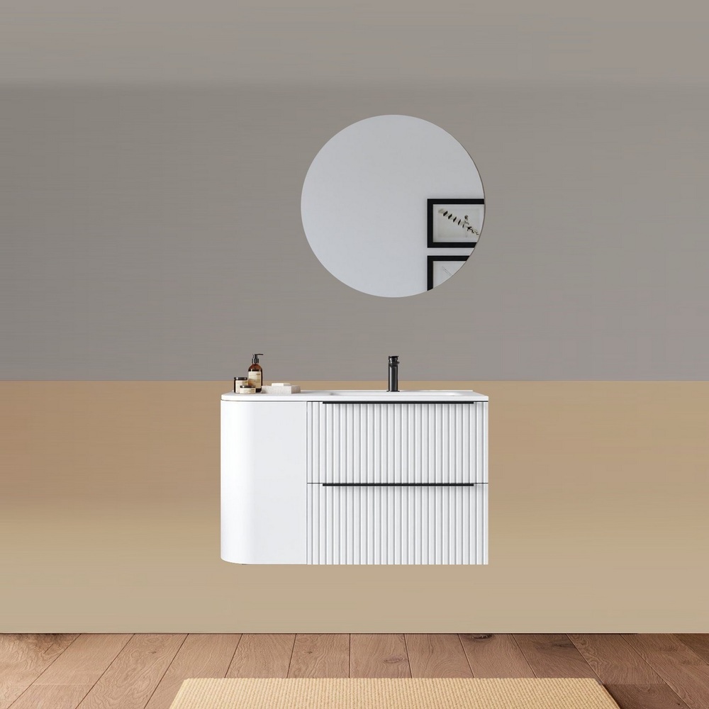 -40%Mobile bagno sospeso da 90 cm, caratterizzato da un angolo stondato. Disponibile in due versioni: con lavabo decentrato sulla destra oppure sulla sinistra. Base composta da due cassetti con frontali ad effetto cannettato e un anta satinata. Lo specchio è incluso nel prezzo.