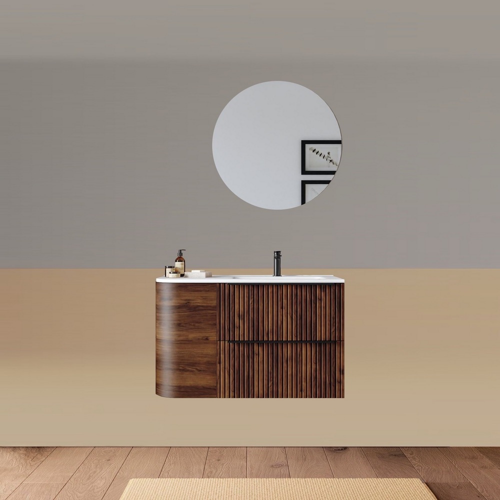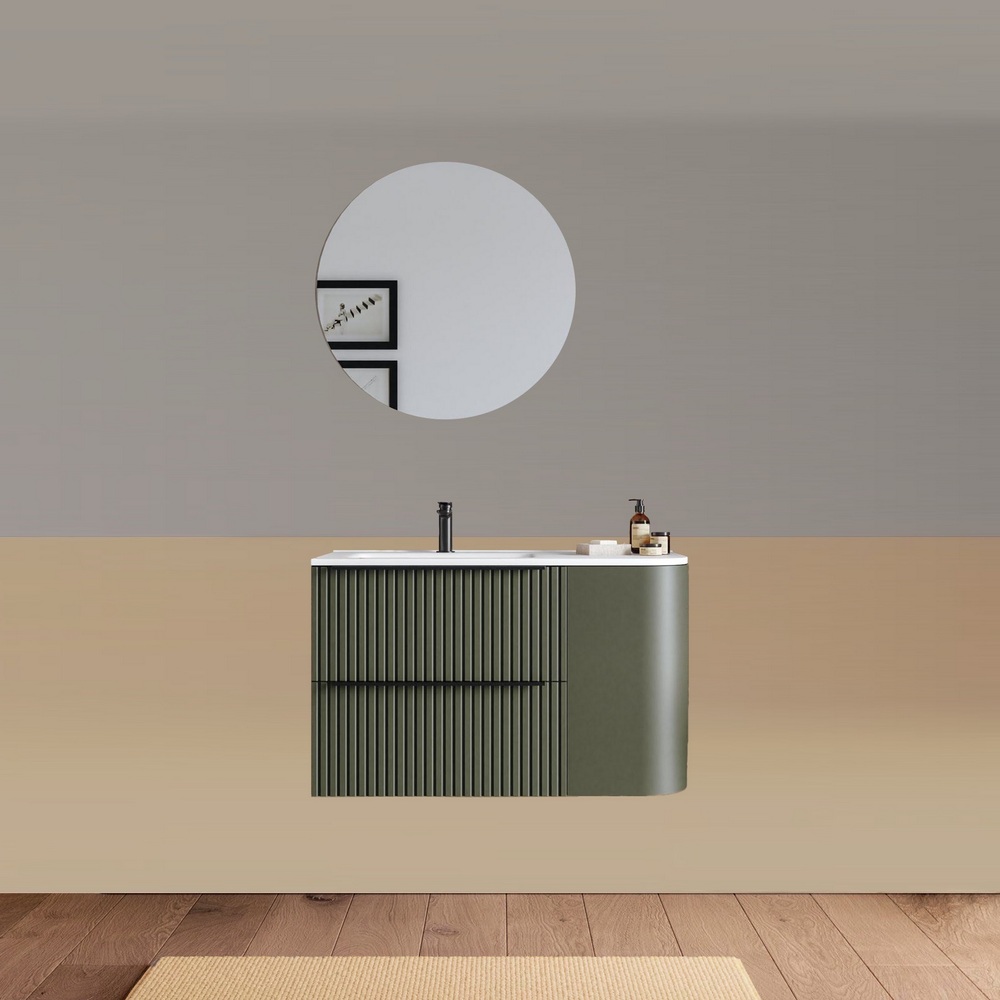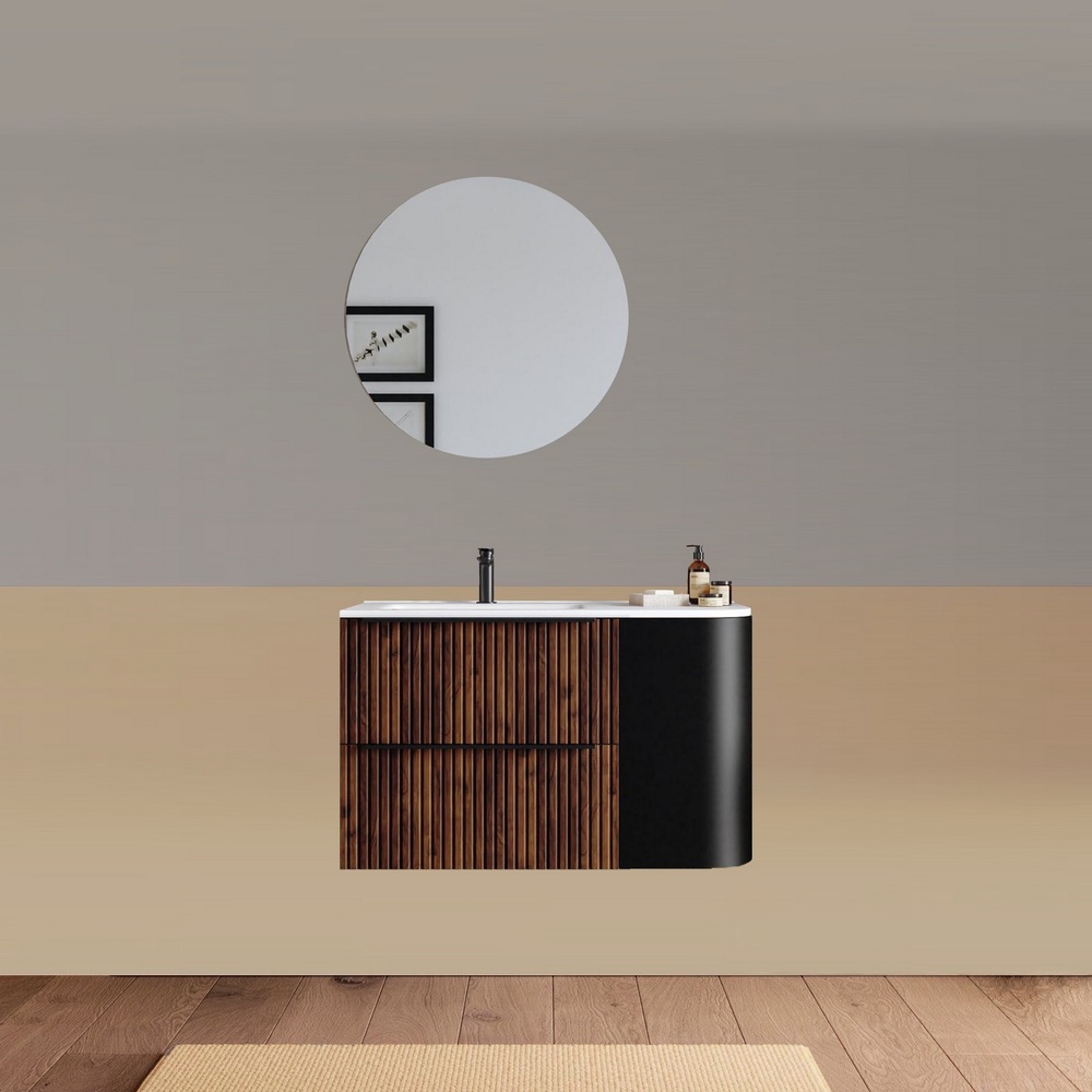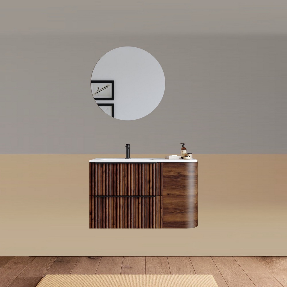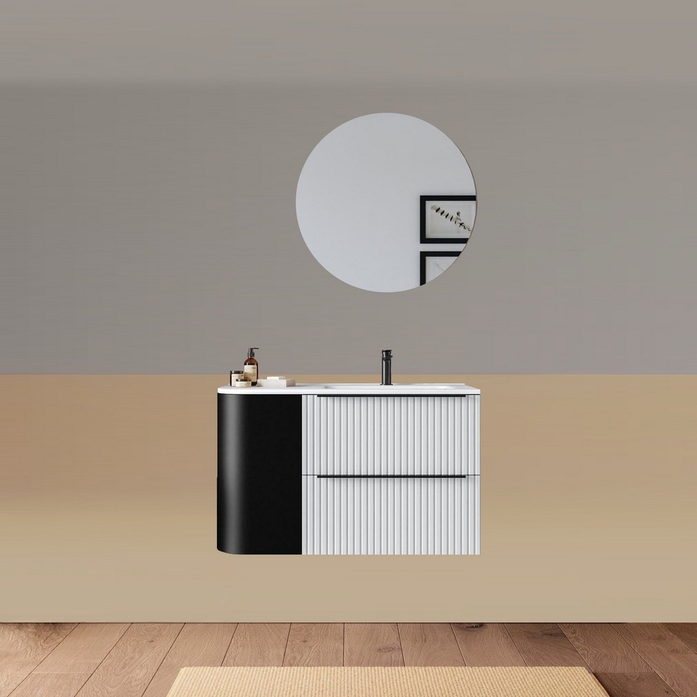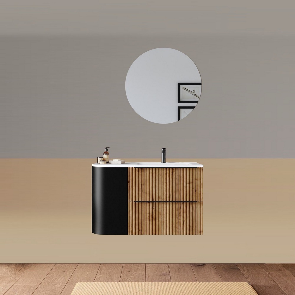 -40%Mobile bagno sospeso da 90 cm, caratterizzato da un angolo stondato. Disponibile in due versioni: con lavabo decentrato sulla destra oppure sulla sinistra. Base composta da due cassetti con frontali ad effetto cannettato e un anta satinata. Lo specchio è incluso nel prezzo.