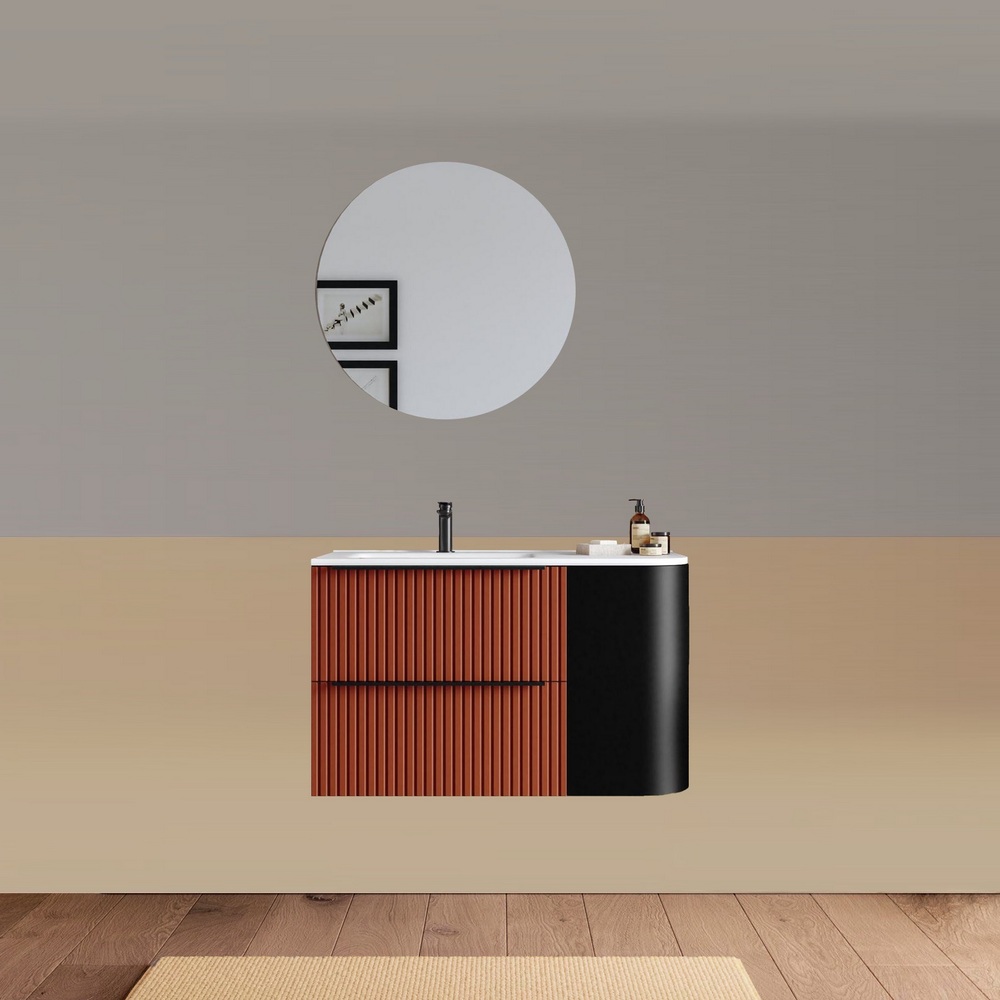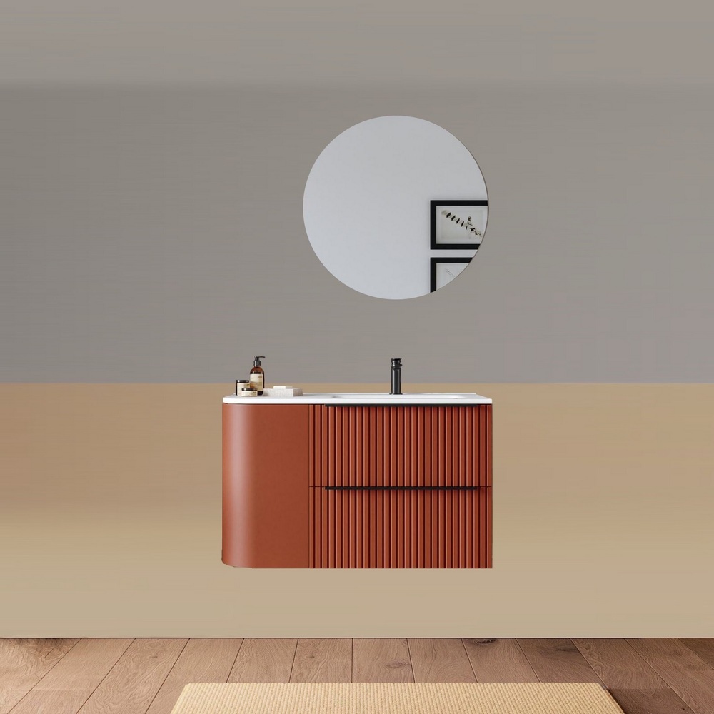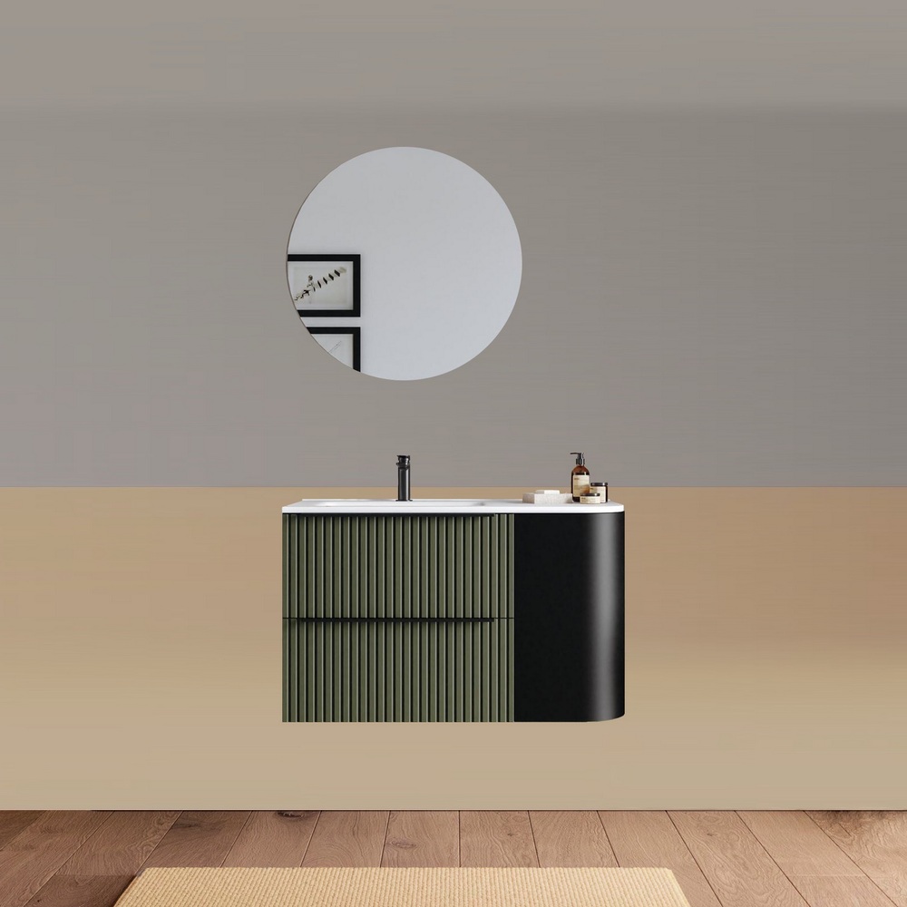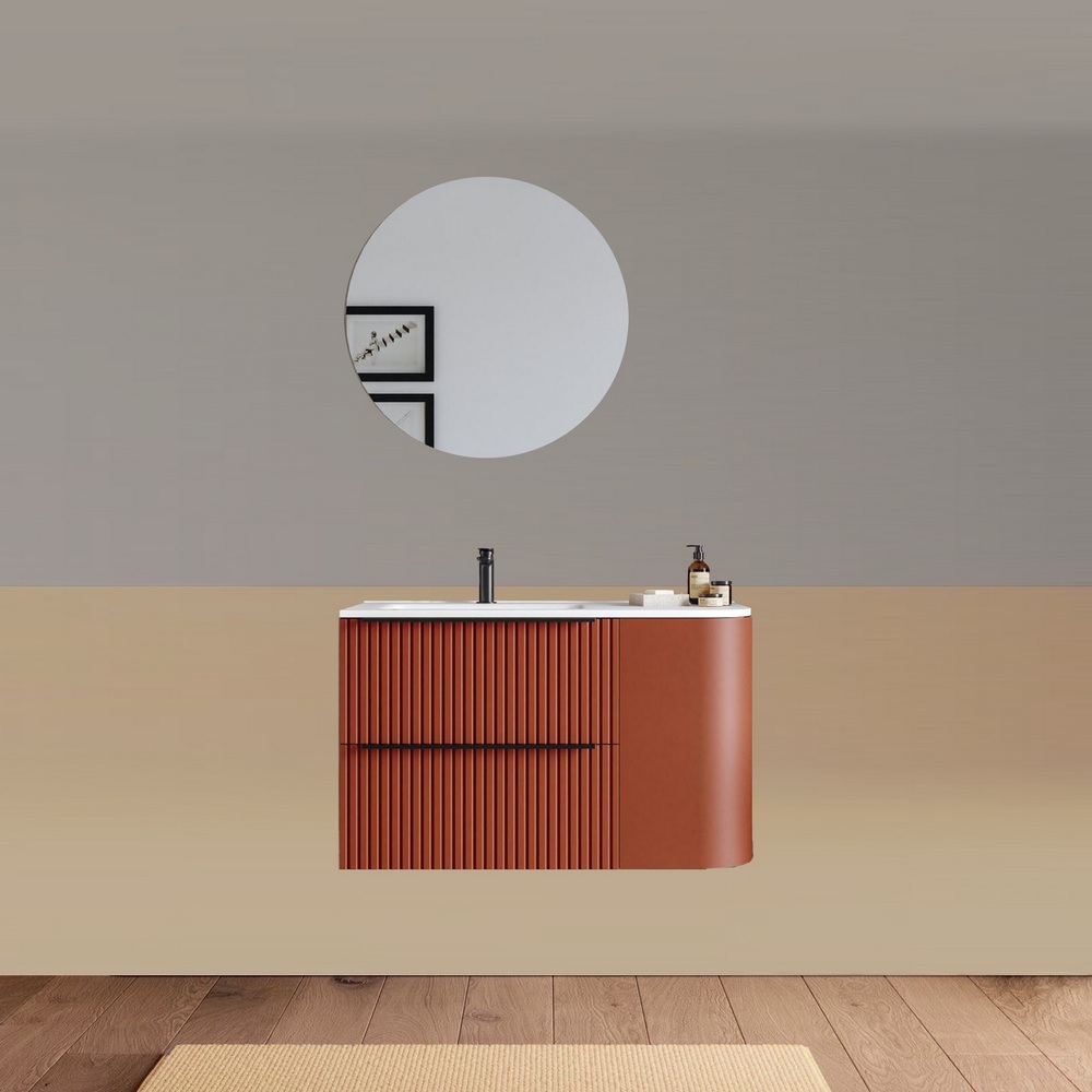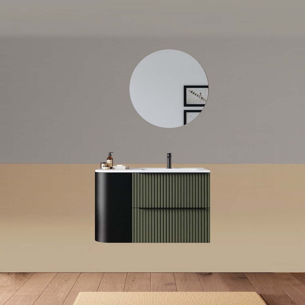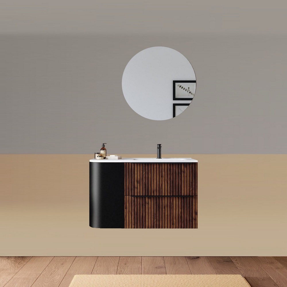 -40%Mobile bagno sospeso da 90 cm, caratterizzato da un angolo stondato. Disponibile in due versioni: con lavabo decentrato sulla destra oppure sulla sinistra. Base composta da due cassetti con frontali ad effetto cannettato e un anta satinata. Lo specchio è incluso nel prezzo.