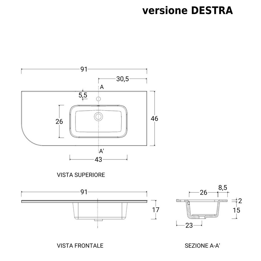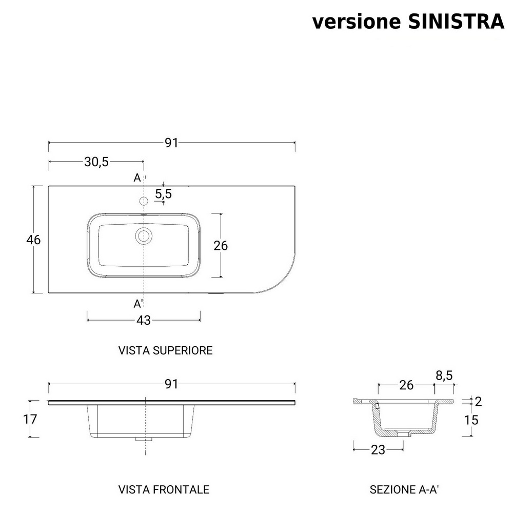 Lavabo in porcellana Bianco Opaco, con vasca decentrata A DESTRA oppure A SINISTRA