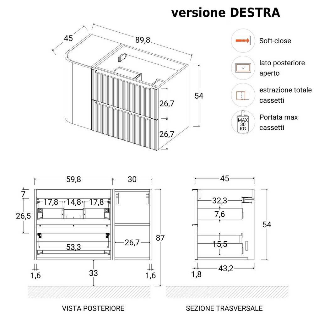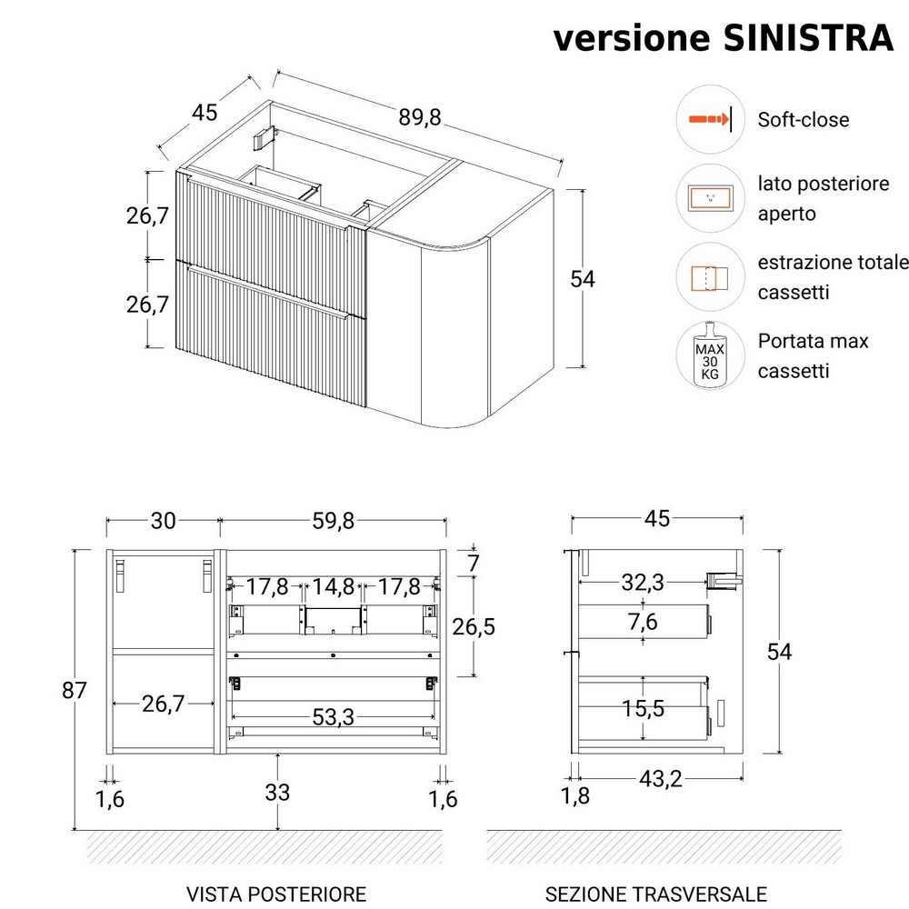 Mobile bagno sospeso da 90 x P45 x H54 cm