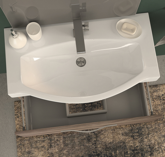 NEWS è un mobile dalle discrete dimensioni (84x38x55 cm), comodo ma non ingombrante, che risulta interessante per la sua linea delicata e moderna. In legno MDF, è composto da due cassettoni con guide con ammortizzatore e maniglie in acciaio cromato lucide ed è dotato di lavabo in ceramica di misura 84x38x55 cm. Il mobile è disponibile nei colori grigo scuro, larice, bianco lucido e blu metallizzato. La specchiera 55×90 cm è provvista di applique, tuttavia si possono visionare altri tipi di specchi sulla categoria “specchiere” del nostro sito.