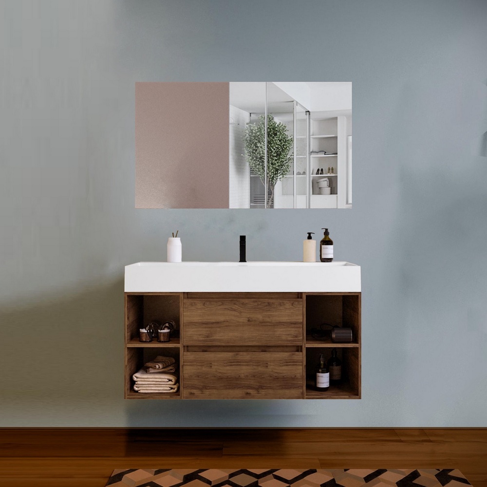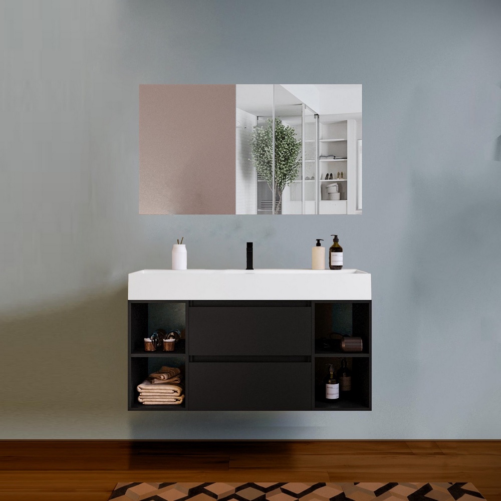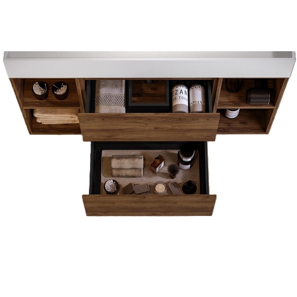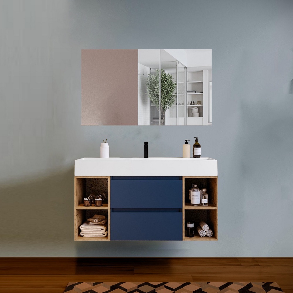 -48%Arredo moderno disponibile in 5 colori: nero, blu-rovere, rovere, noce, bianco. La base al centro è composta da 2 cassetti mentre sui lati è possibile scegliere se avere 2 ante oppure 4 vani a giorno (2 a destra e 2 a sinistra). Sono compresi nel prezzo il top lavabo in resina bianco opaco e lo specchio. E’ inoltre possibile abbinare una colonna sospesa e un faretto led per lo specchio.