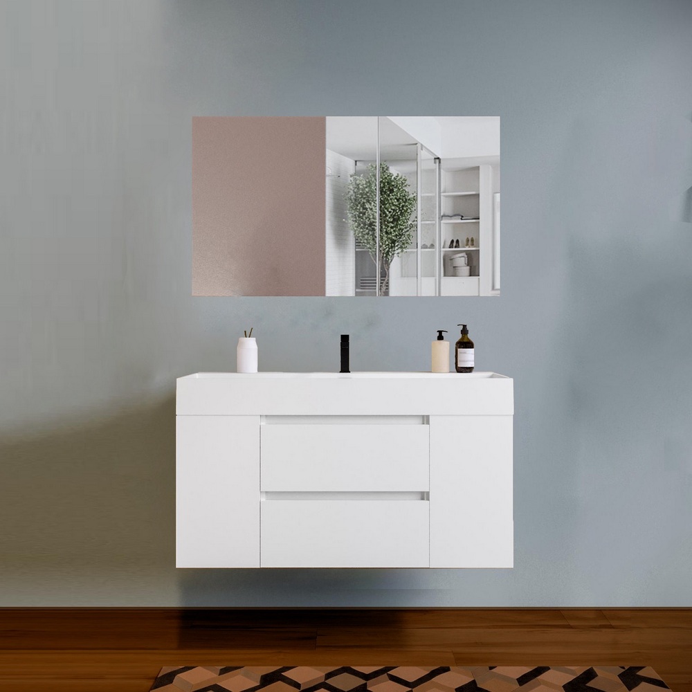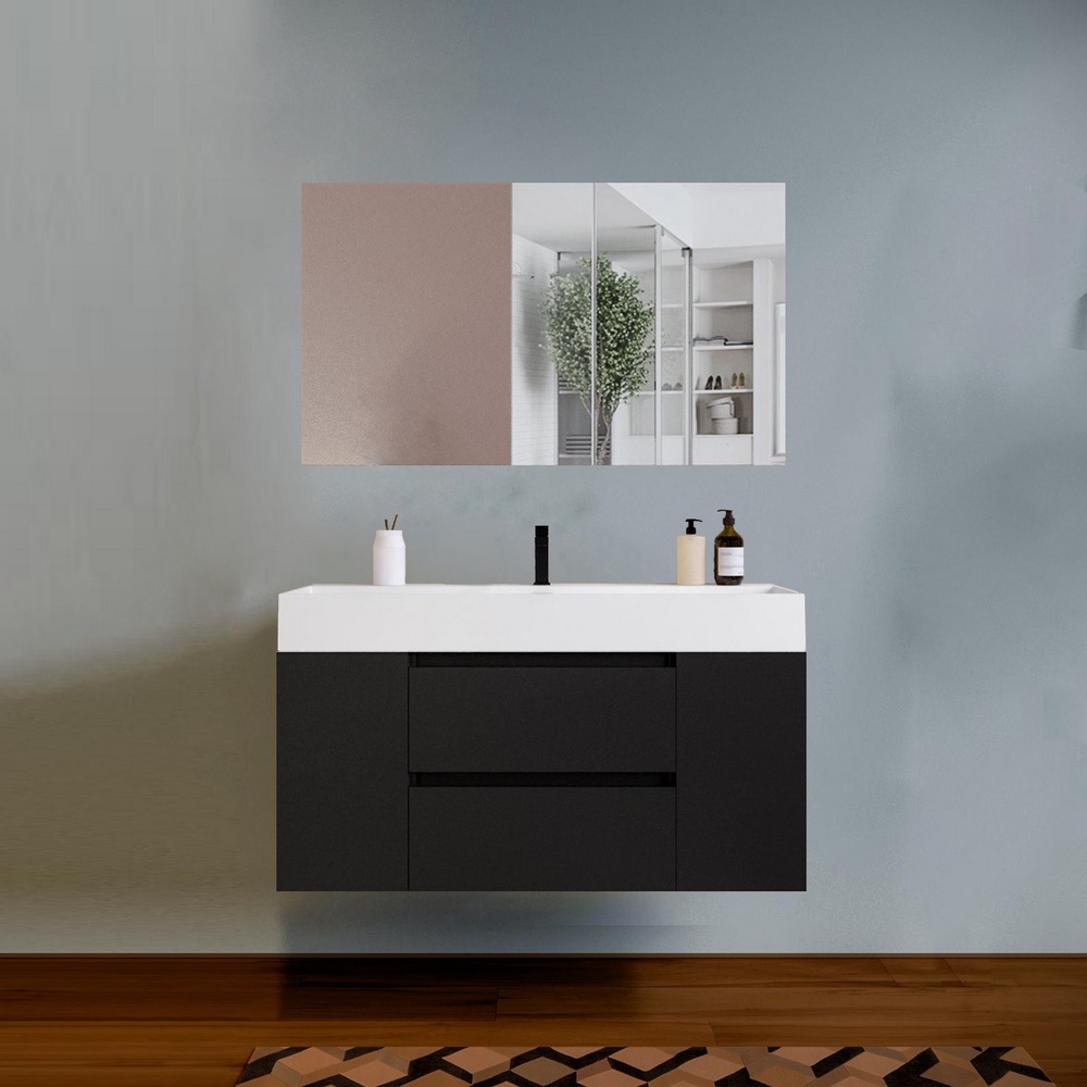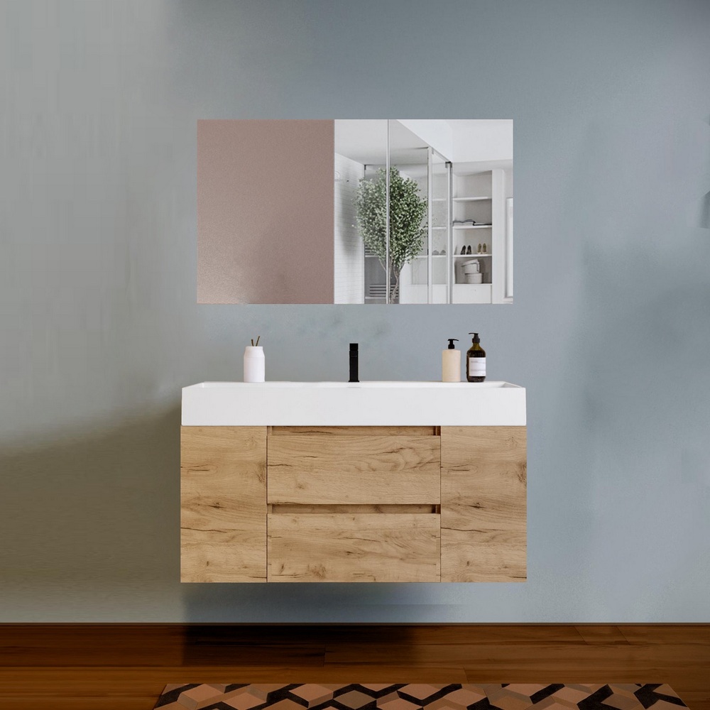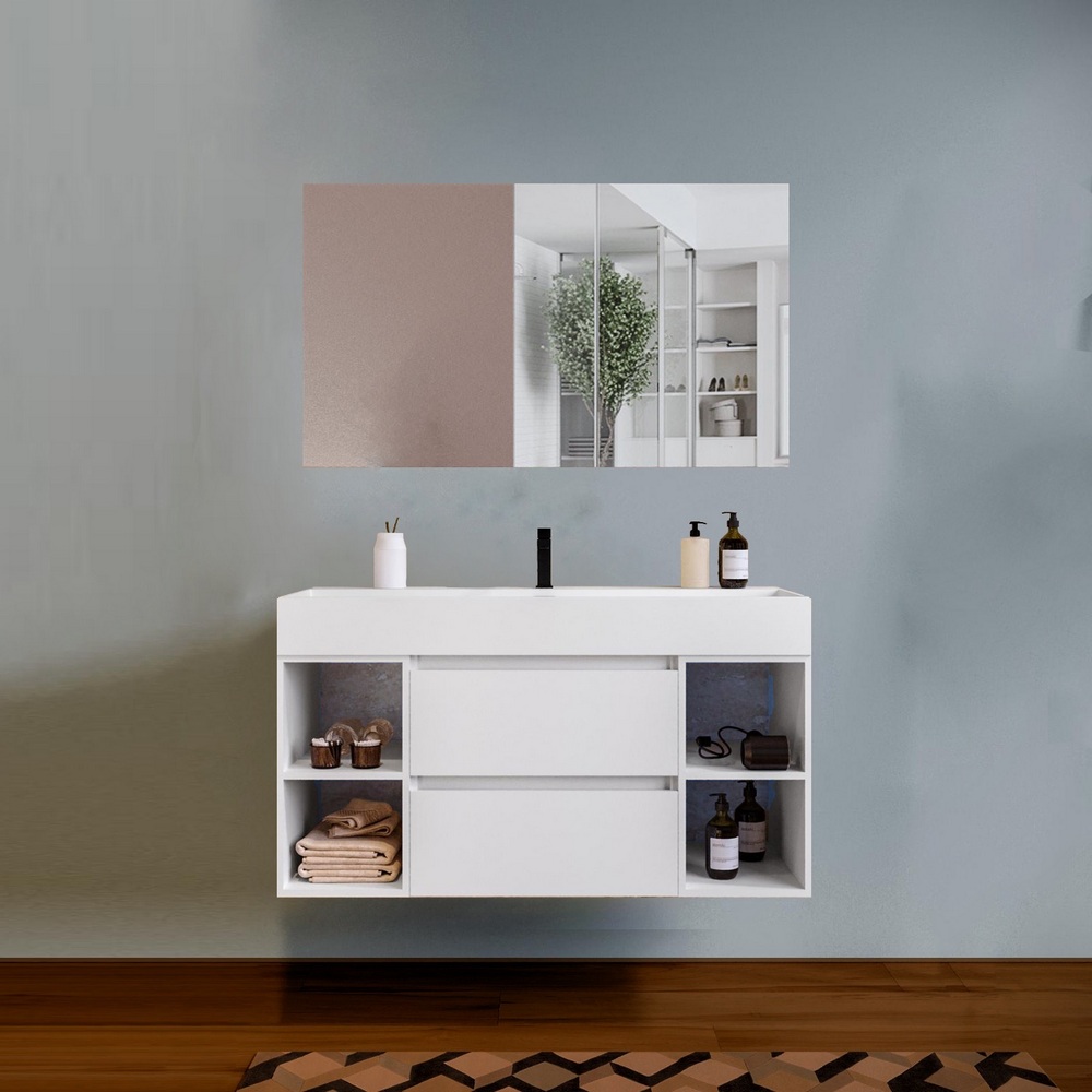 -48%Arredo moderno disponibile in 5 colori: nero, blu-rovere, rovere, noce, bianco. La base al centro è composta da 2 cassetti mentre sui lati è possibile scegliere se avere 2 ante oppure 4 vani a giorno (2 a destra e 2 a sinistra). Sono compresi nel prezzo il top lavabo in resina bianco opaco e lo specchio. E’ inoltre possibile abbinare una colonna sospesa e un faretto led per lo specchio.