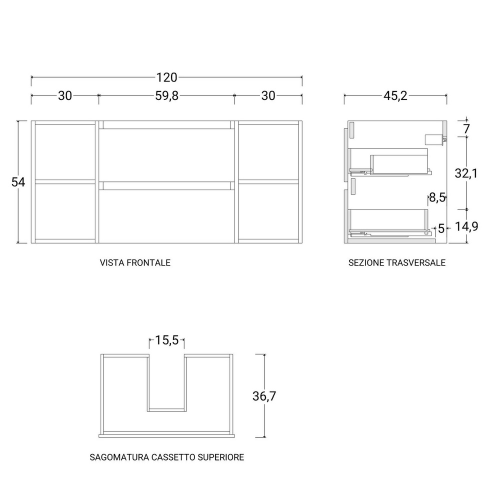 - con 2 cassetti centrali e 4 vani a giorno laterali