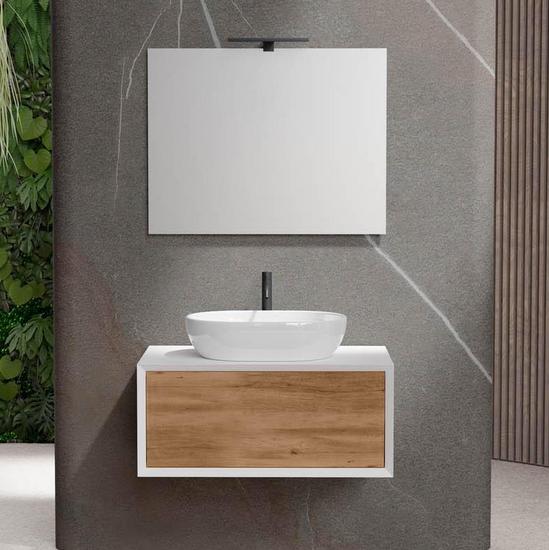 Mobile bagno sospeso Cassandra da 90 cm con cassettone effetto legno e specchio filolucido incluso