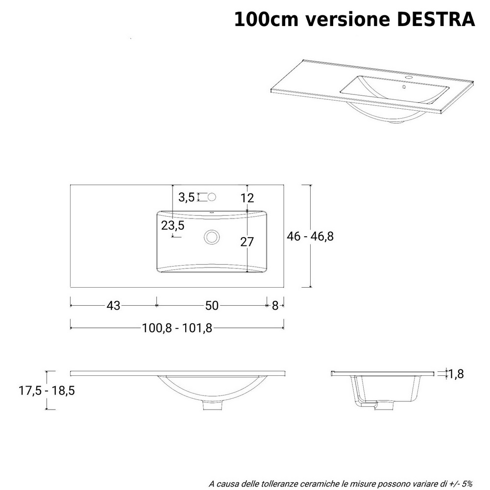 Lavabo in ceramica bianco lucido, con vasca decentrata A DESTRA oppure A SINISTRA (sopra i cassetti)