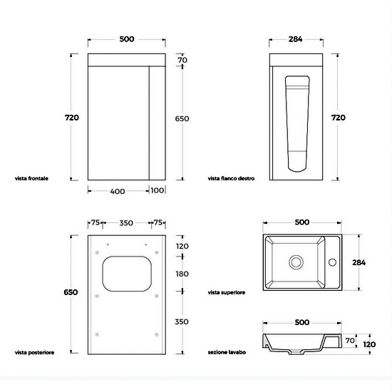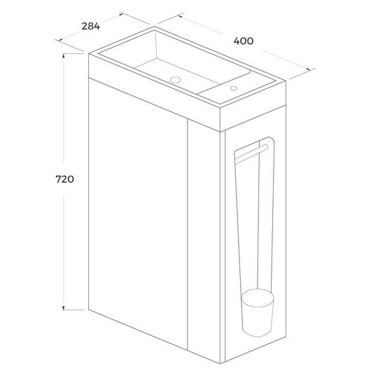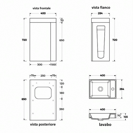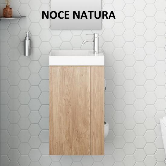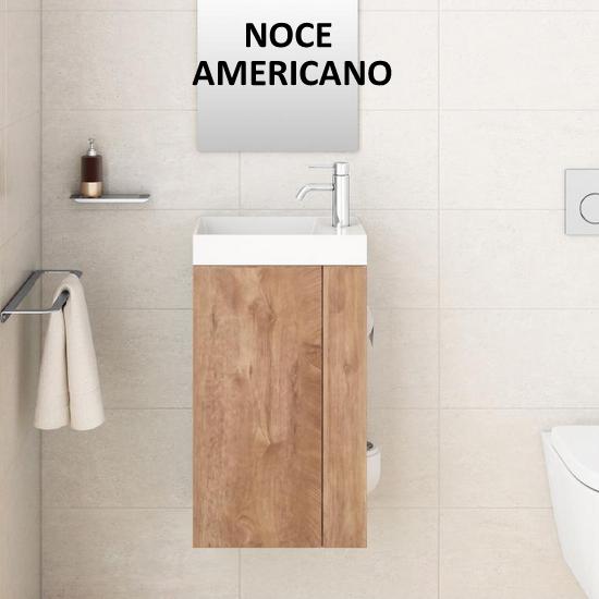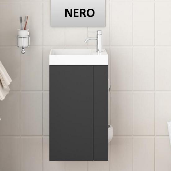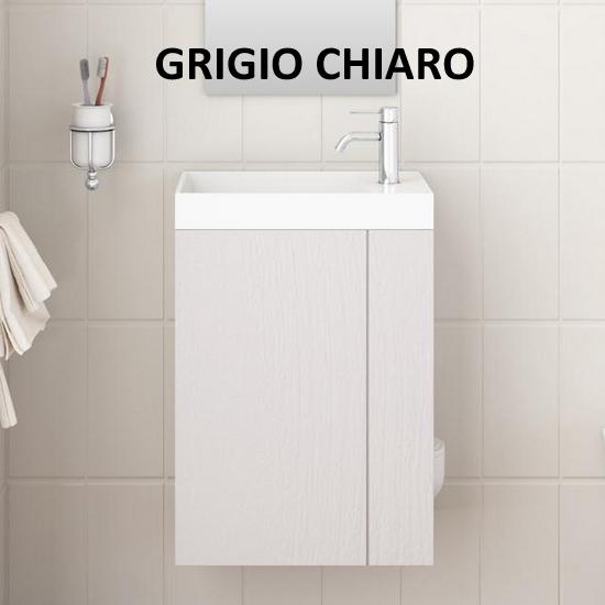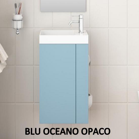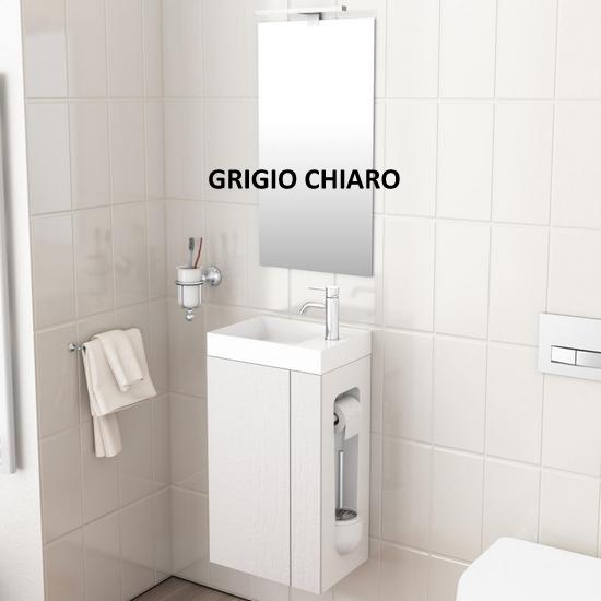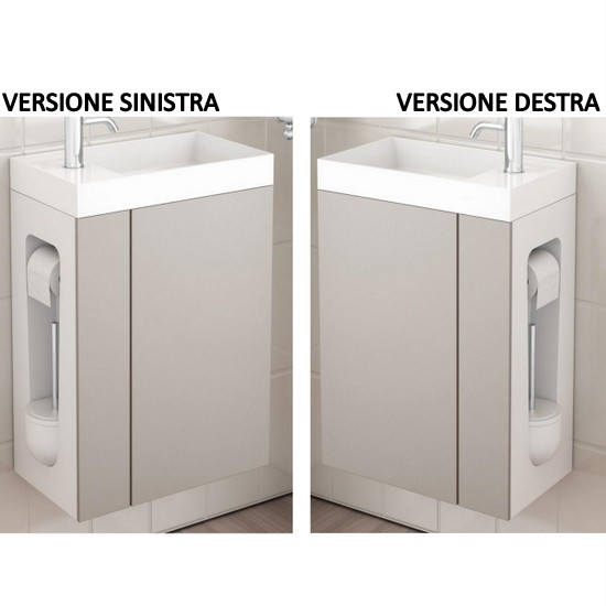 Pratica soluzione salva-spazio da 28,4 cm di profondità, lunghezza disponibile sia da 40cm che da 50 cm. La composizione è completa di base porta lavabo (disponibile in ben 11 colori), lavabo in marmo artificiale bianco, specchio, porta rotolo carta igienica e porta scopino. E’ possibile scegliere anche se avere il mobile in versione destra o sinistra (vedere foto).