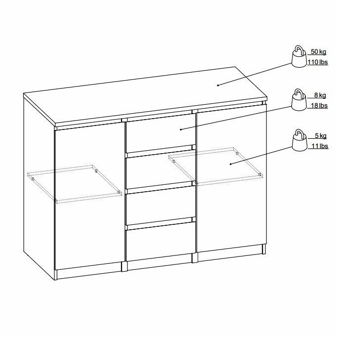 Composto da 2 ante (ciascuna con 1 ripiano interno) e 4 cassetti centrali