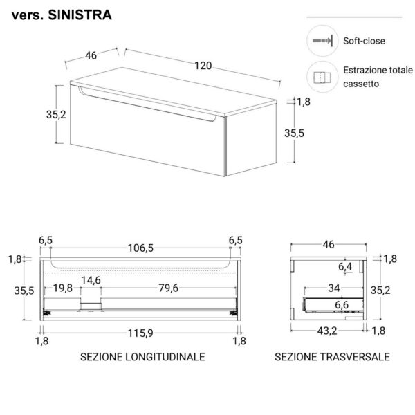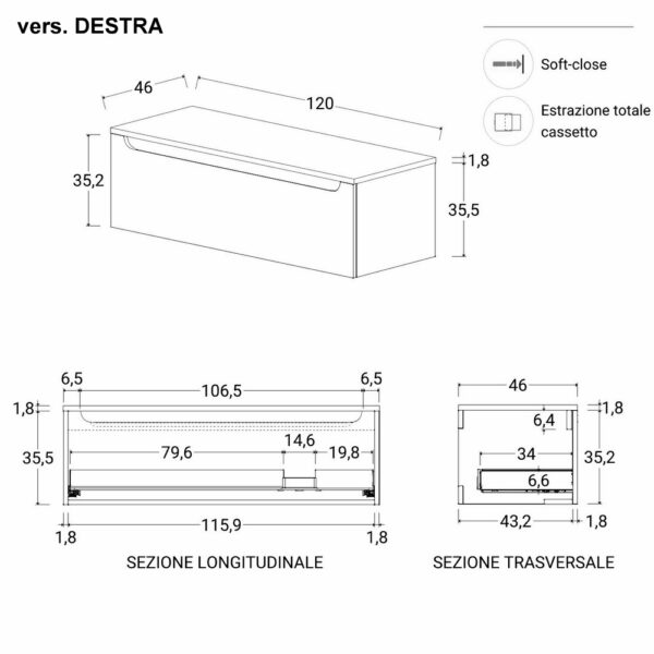 n. 1 base sospesa da 120xP46xH37,3 cm composta da un cassettone (apertura a gola, chiusura soft close)
