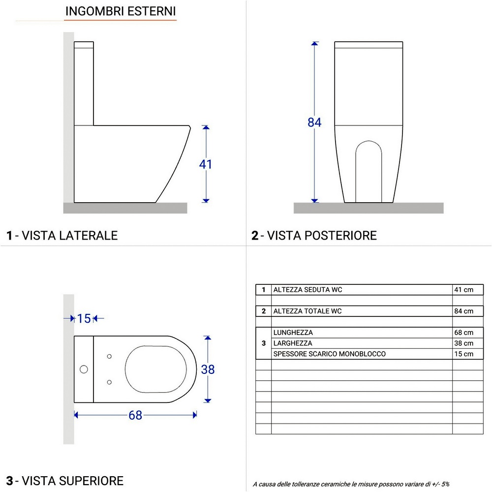 Wc monoblocco da 38xP68 cm (altezza totale 84 cm; altezza seduta 41 cm)