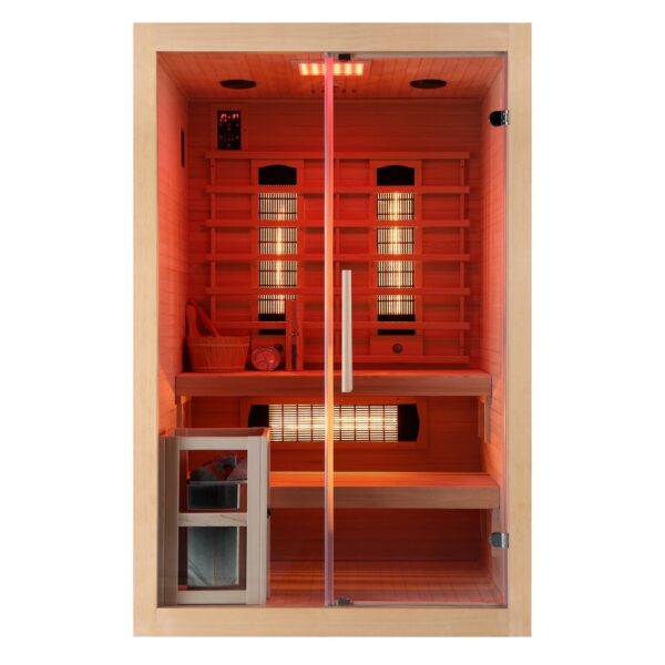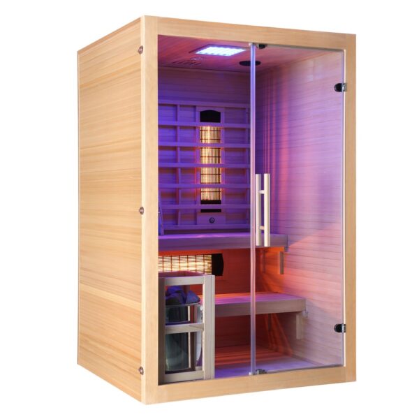 -33%Sauna combinata 130×120 in legno Hemlock, per 2 persone; completa di cromoterapia a 7 colori, bluetooth, secchio e paletta, clessidra e termometro