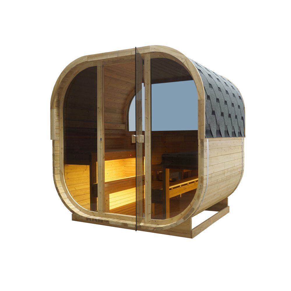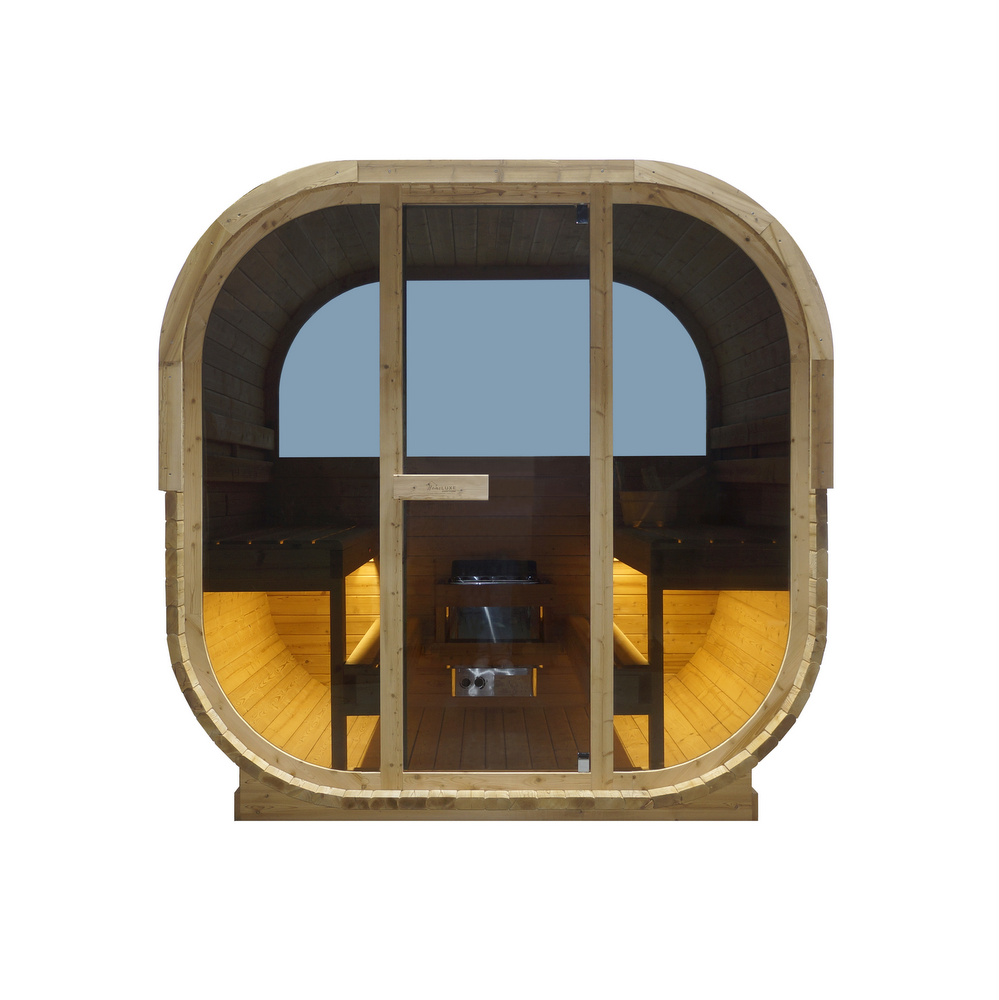 -17%Sauna finlandese adatta per essere installata all’esterno, realizzata in legno di abete rosso e vetro da 8mm di spessore.