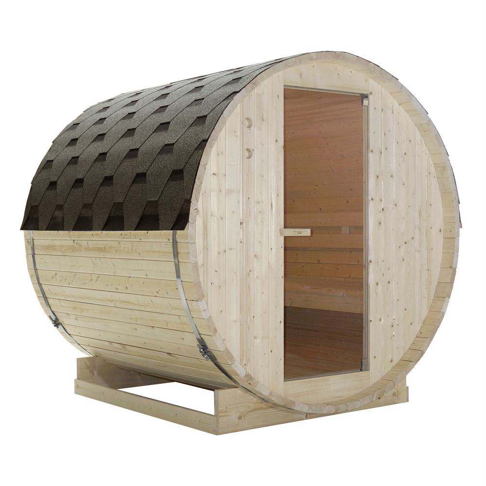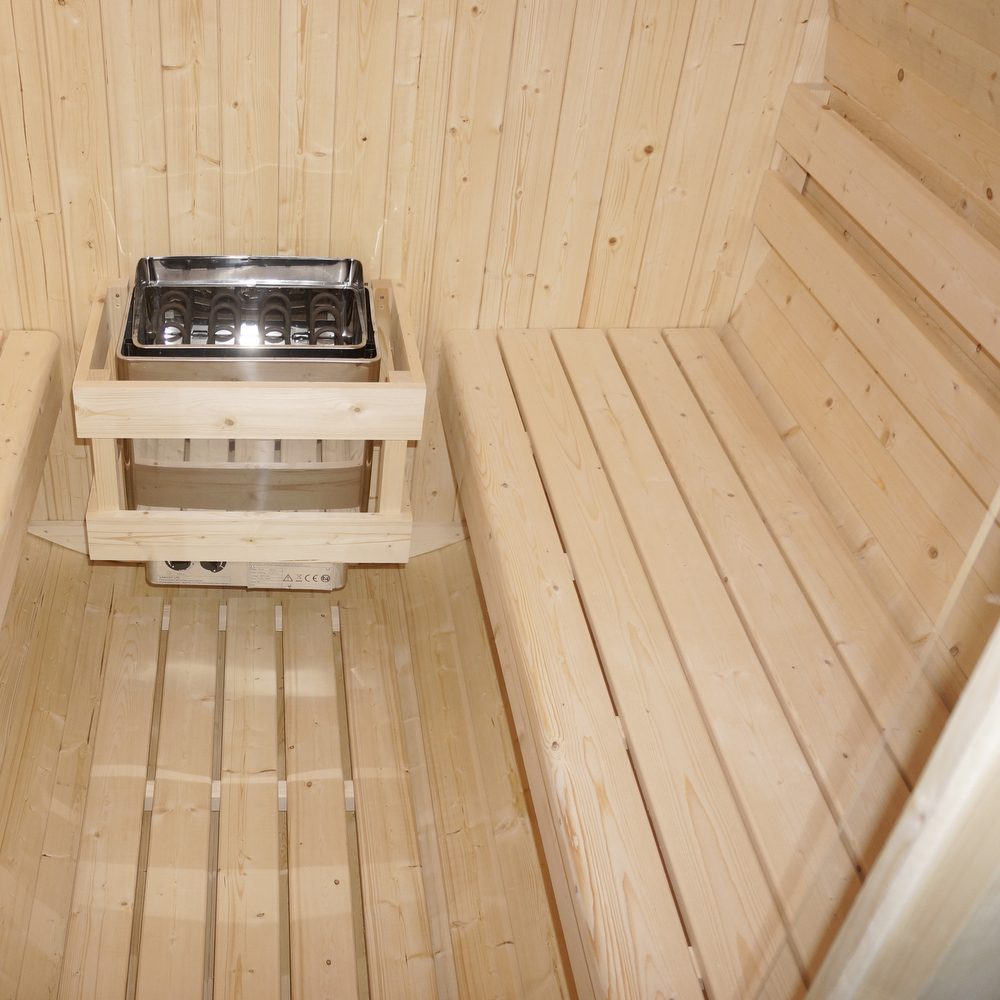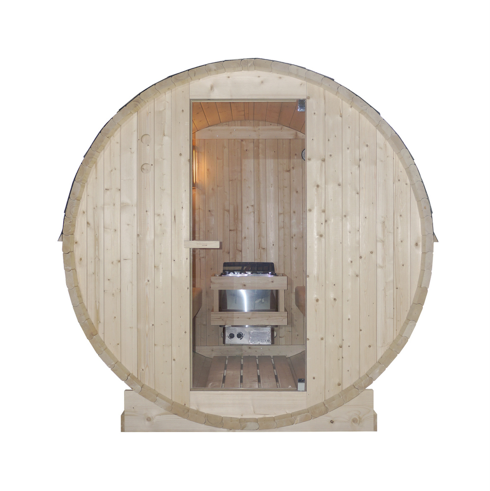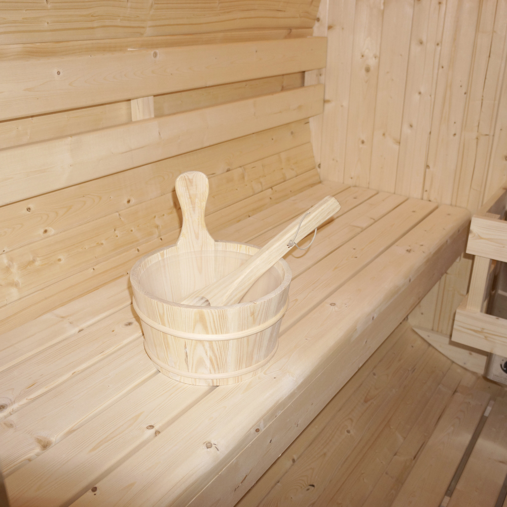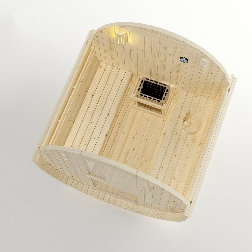 -13%Sauna caratterizzata da una struttura a forma di botte, realizzata in legno di abete rosso, adatta per essere installata all’esterno.
