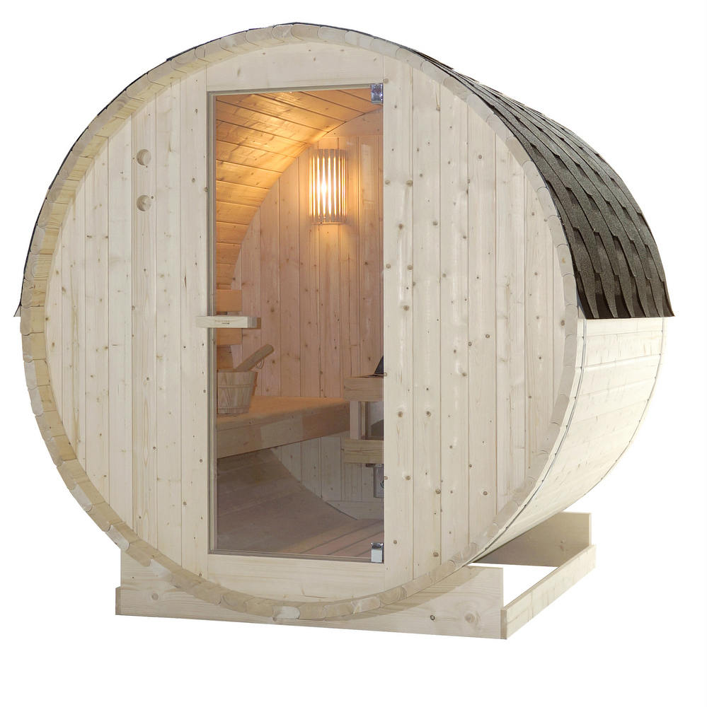 Sauna finlandese per esterno, a forma di botte
