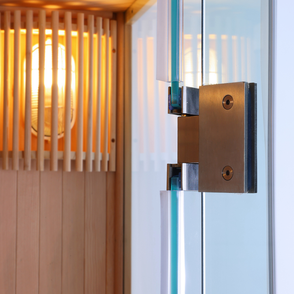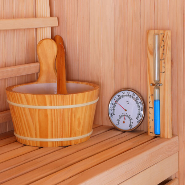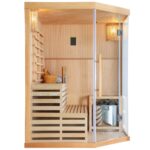 -35%Sauna per 3 persone, realizzata in legno Hemlock e vetro da 8mm. Accessori inclusi nel prezzo: stufa con pietre, clessidra, termometro e secchiello con mestolo.
