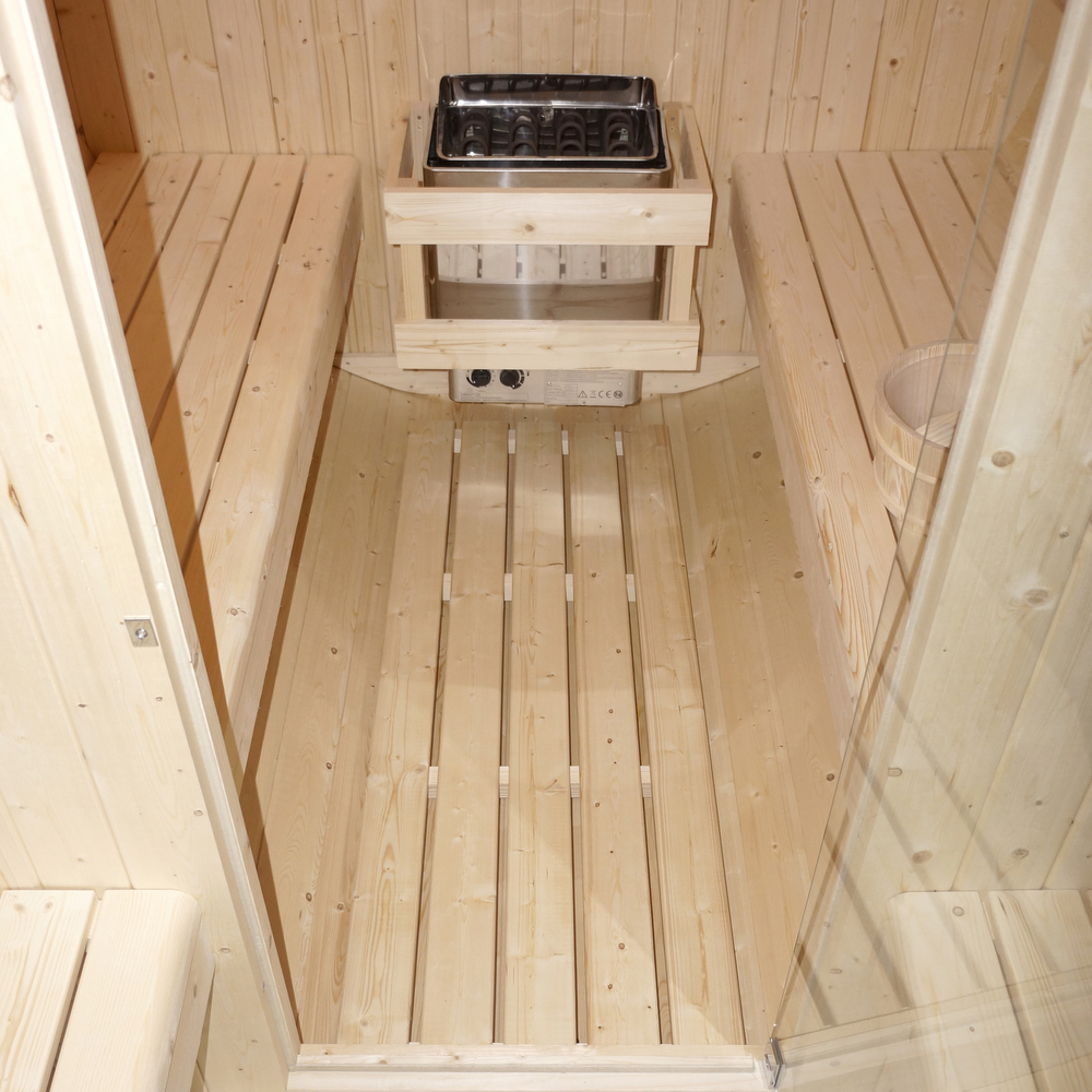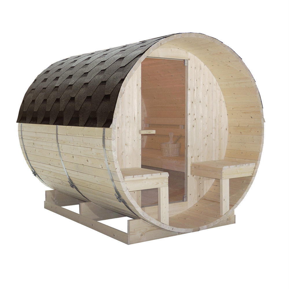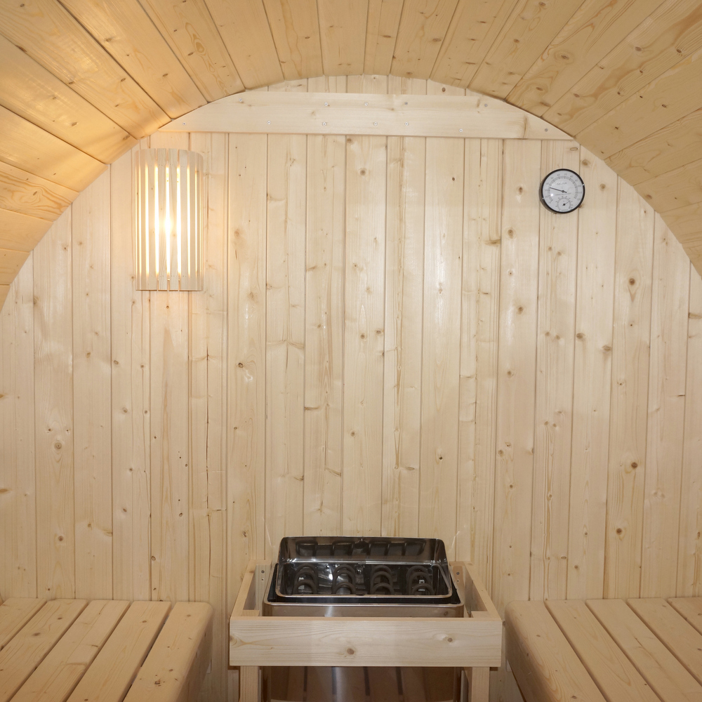 -8%Cabina in legno di abete rosso, dalla particolare forma a botte, adatta per essere installata all’esterno.