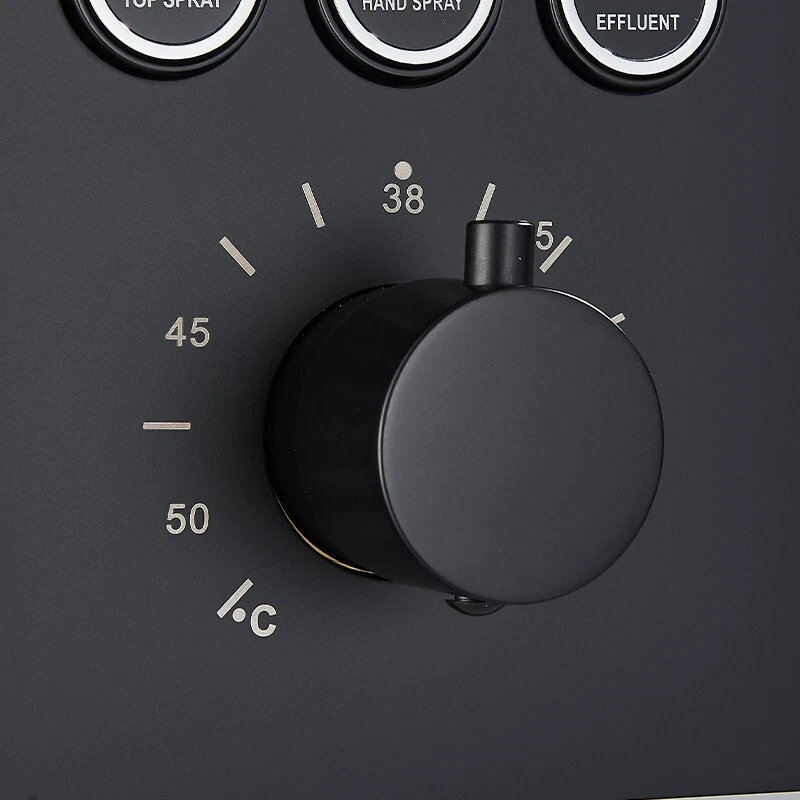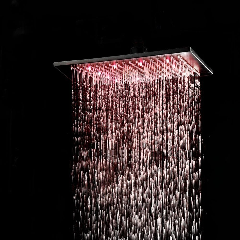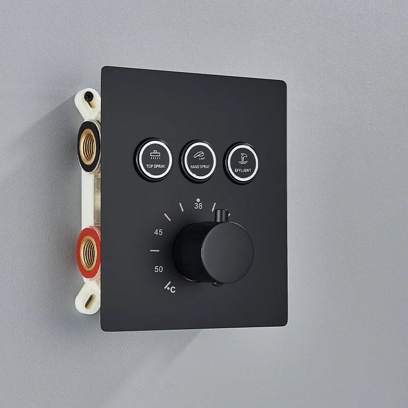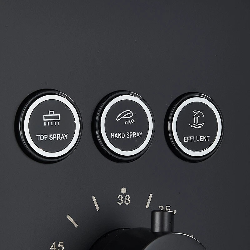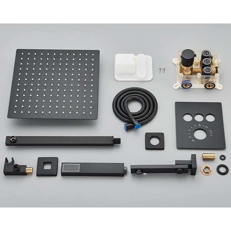 -51%Kit completo di rubinetteria per doccia realizzato in ottone nero. Composto da: soffione con braccio per montaggio a parete e luci led, doccetta laterale con supporto a muro e tubo flessibile, miscelatore termostatico, deviatore a pulsanti, rubinetto girevole per vasca.