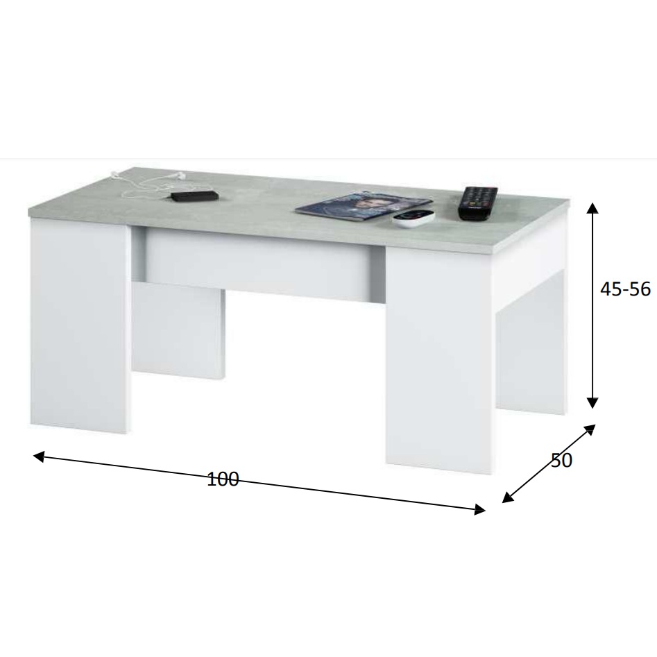Tavolino da caffè cm 100x50xH45 colore cemento-bianco con piano sollevabile BM083