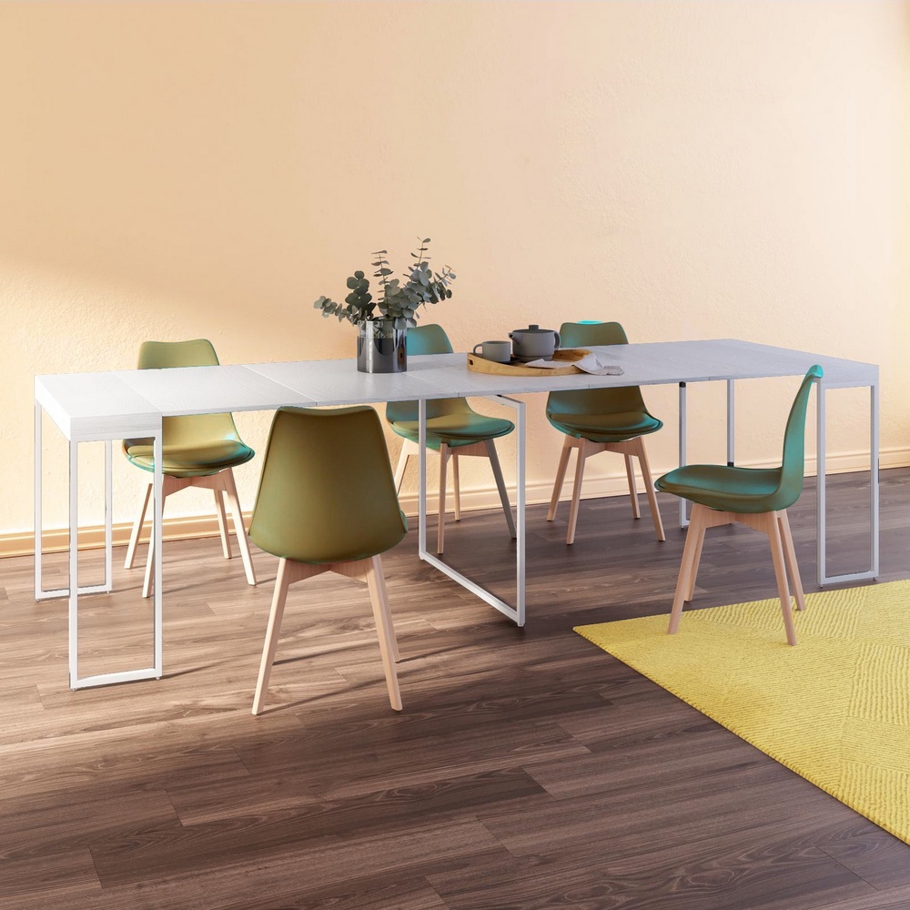 -14%Consolle da 50 cm realizzata interamente in colore bianco. Trasformabile in tavolo da pranzo grazie a ben 5 allunghe da 45 cm ciascuna. La struttura è realizzata in metallo, mentre il piano è in legno mdf.