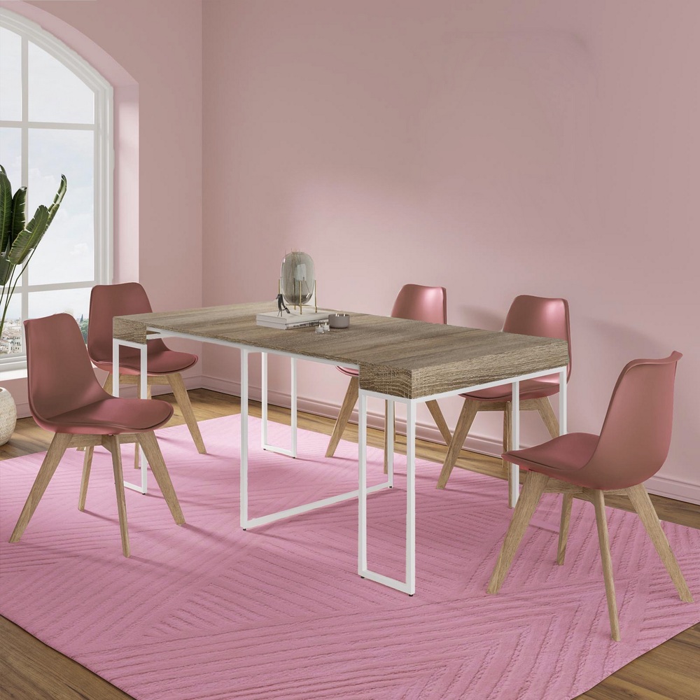 -18%Consolle da 50 cm trasformabile in tavolo da 4-6-8 posti, grazie alle 3 allunghe da 45 cm ciascuna. La struttura è caratterizzata da delle gambe in metallo bianco ed un top rovere