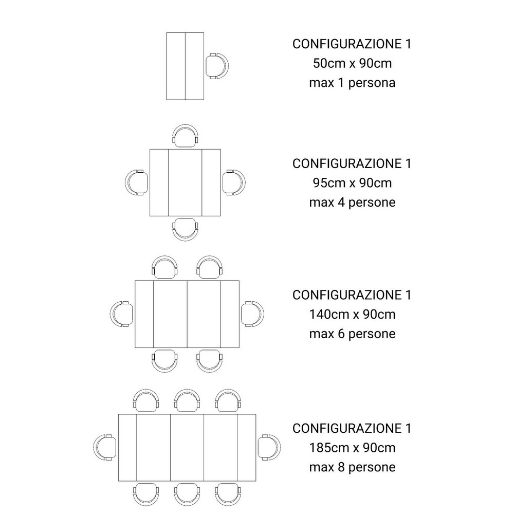 Configurazioni disponibili: 50x90cm (senza allunghe), 95x90cm (con 1 allunga), 140x90cm (con 2 allunghe), 185x90cm (con 3 allunghe)