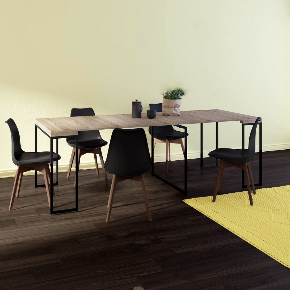 -19%Consolle da 50 cm trasformabile in tavolo da pranzo grazie a ben 4 allunghe da 45 cm ciascuna. La struttura è realizzata in metallo nero, mentre il piano è in legno mdf.