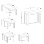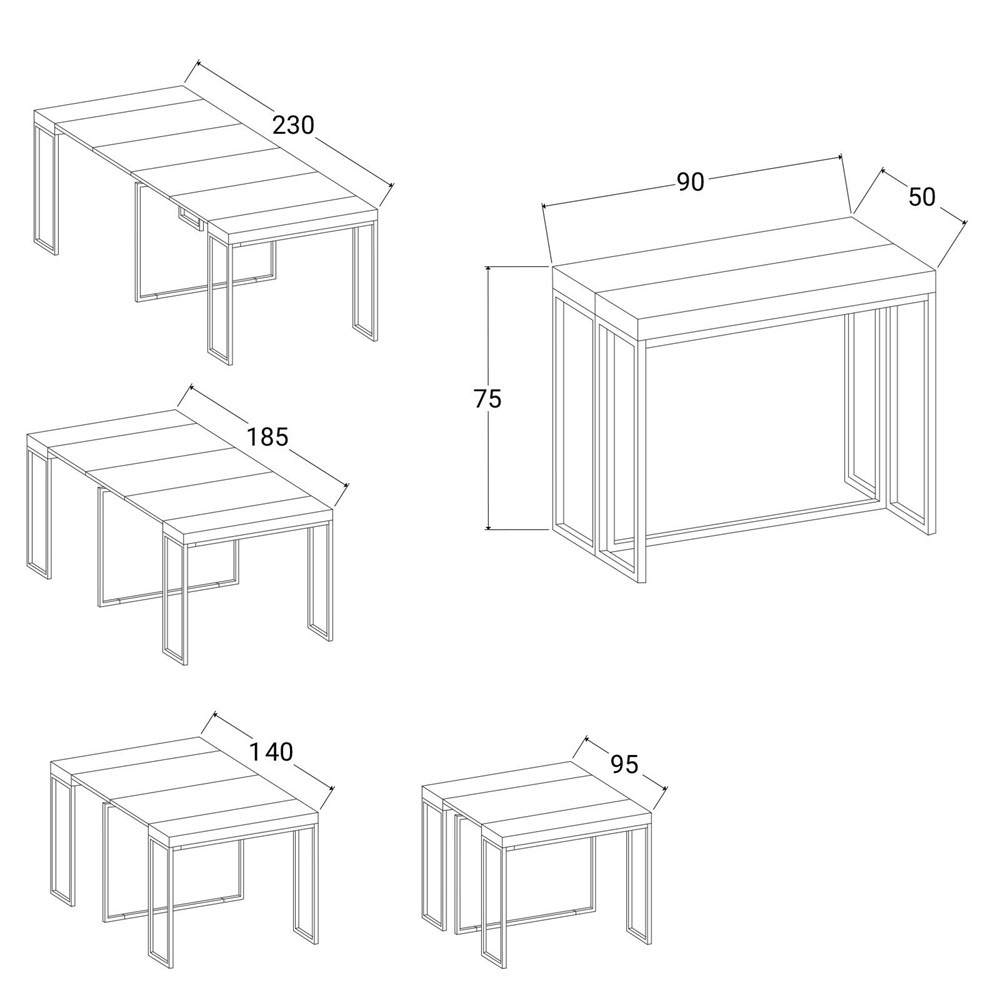 Consolle da 50×90 cm trasformabile in tavolo da pranzo di lunghezza: 95x90cm (con 1 allunga), 140x90cm (con 2 allunghe), 185x90cm (con 3 allunghe), 230x90cm (con 4 allunghe)