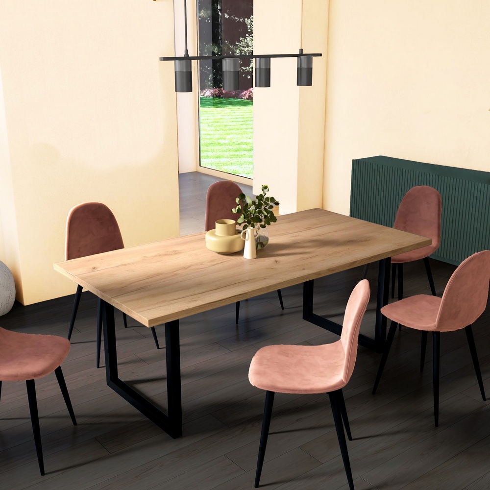 -35%Tavolo da pranzo con piano in legno a scelta tra i colori rovere bianco, rovere grigio, rovere gold o rovere deciso. Le gambe ad “U” sono in metallo, di colore nero opaco, con spessore 5×5 oppure 8×4 cm.